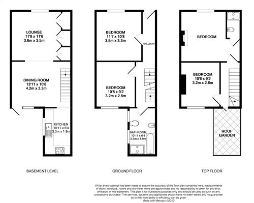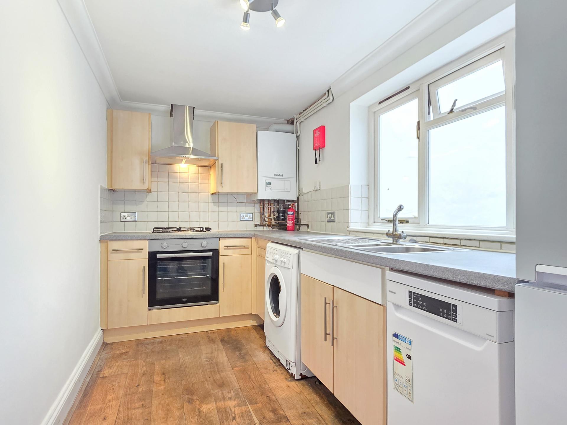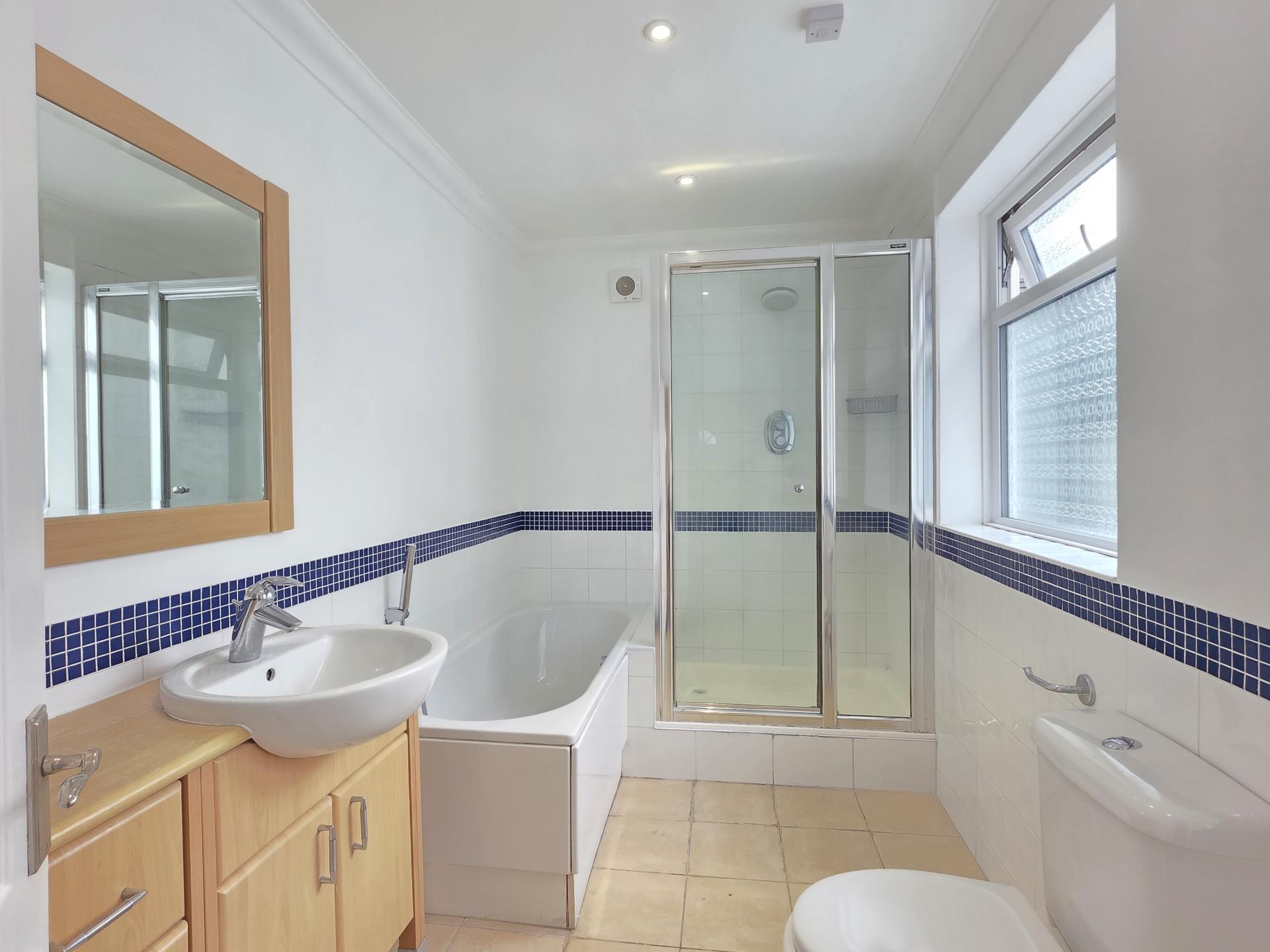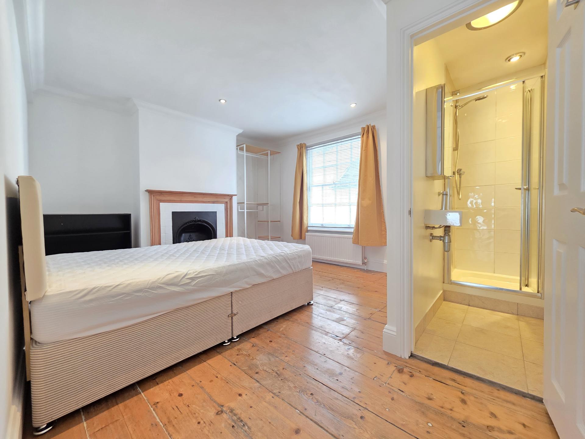 Spacious four bedroom house set over multiple levels. The basement level features an open-plan kitchen and dining area with appliances including a hob, oven, fridge/freezer, washing machine, and dishwasher, along with a large living area. On the ground floor, there are two double bedrooms one with an en-suite and a separate bathroom with a bath and shower. The first floor offers two additional double bedrooms, and the property is complete with a private roof terrace.