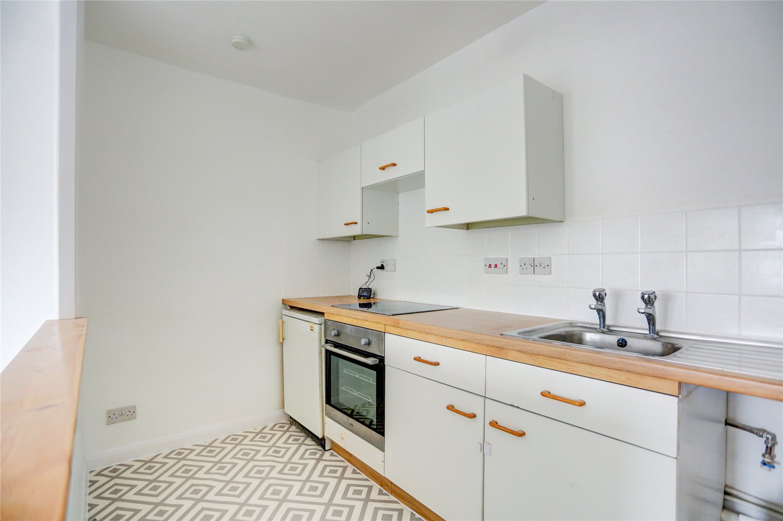 This unfurnished one-bedroom flat features an open-plan living and kitchen area with appliances including a hob, oven, and a small fridge/freezer. While a washing machine is not provided, plumbing is available for one. The property also includes a modern double bedroom and a separate bathroom with a bath and overhead shower.