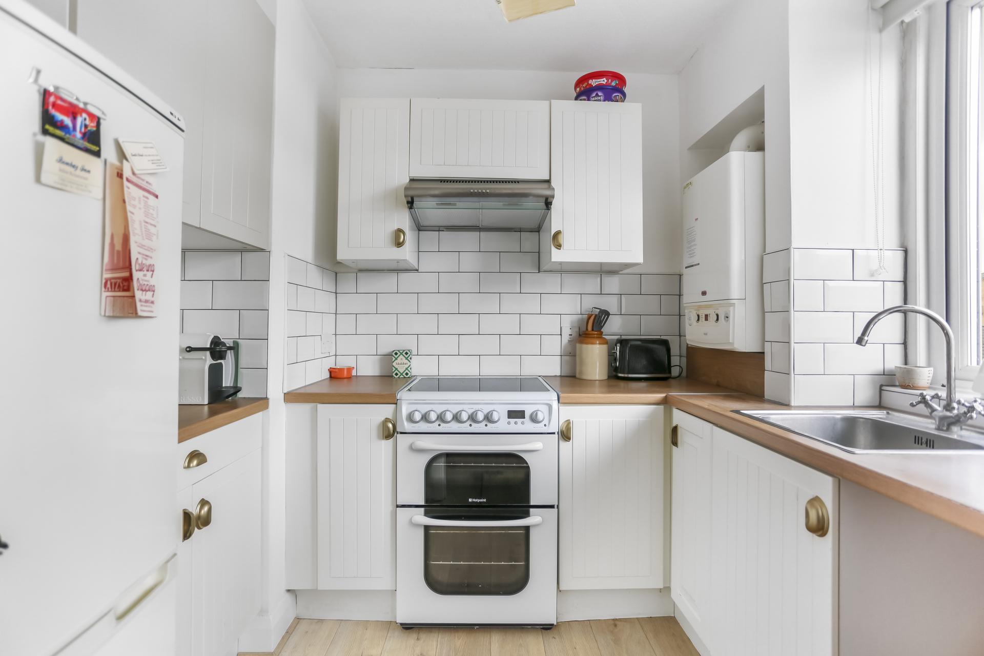 This charming one-bedroom flat offers a bright west-facing lounge with attractive wood floors, providing a welcoming living space. A separate kitchen includes an electric cooker and fridge, with plumbing and space available for a washing machine. The modern bathroom is fitted with a bath and over-bath electric shower. The property further benefits from a double-sized bedroom, gas heating, and double glazing. Residents also enjoy access to west-facing communal gardens complete with a washing line.