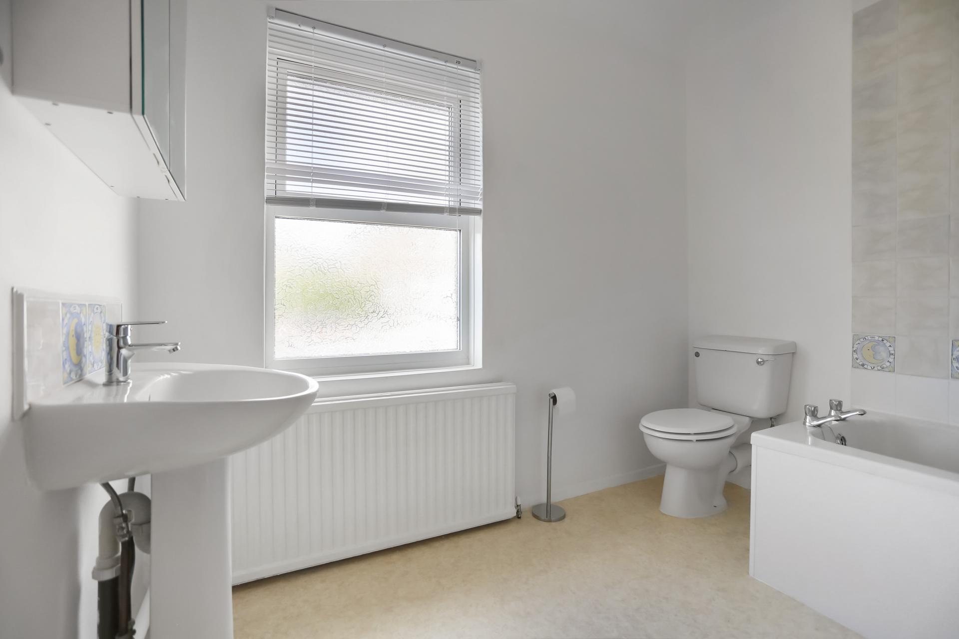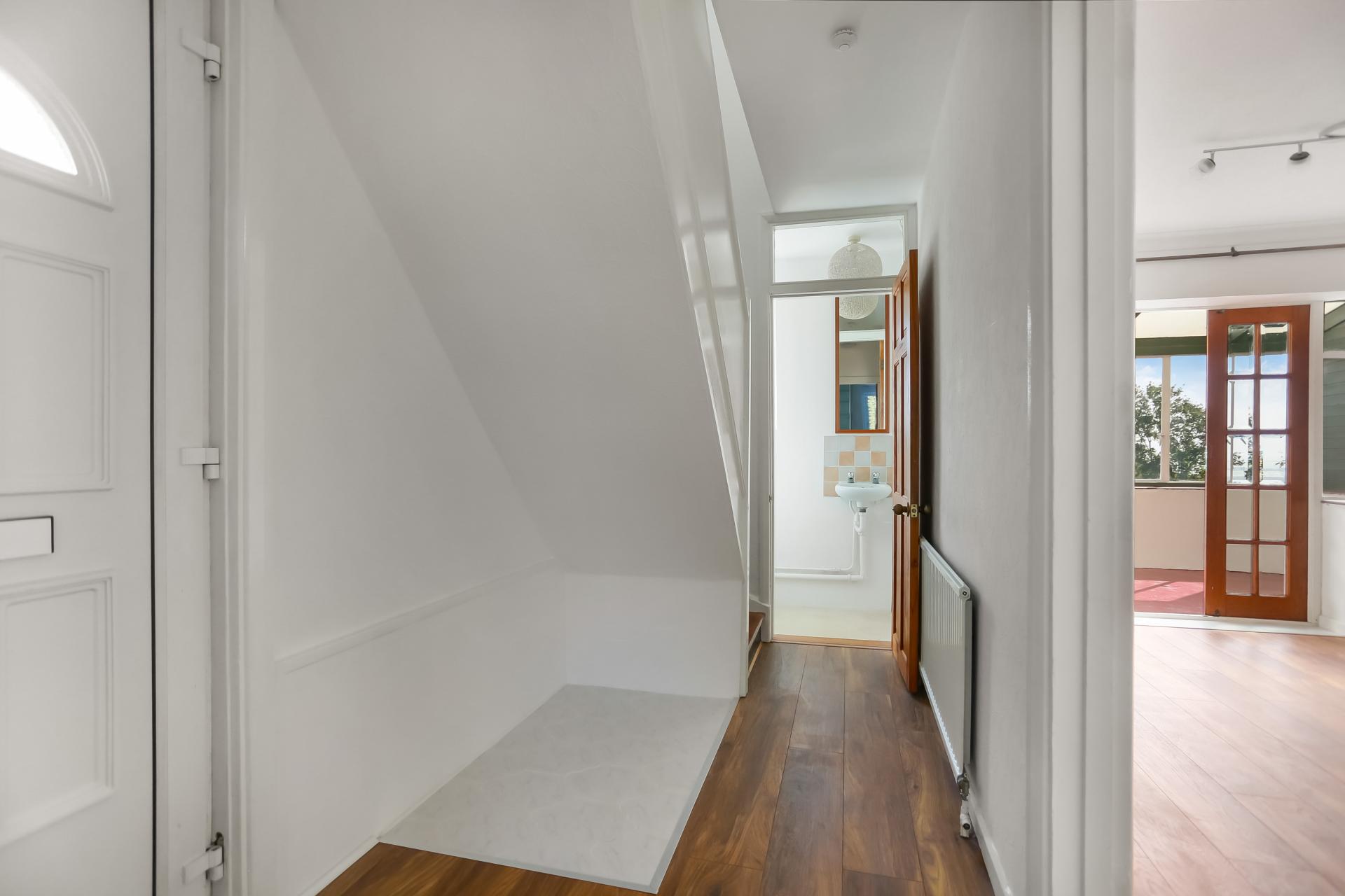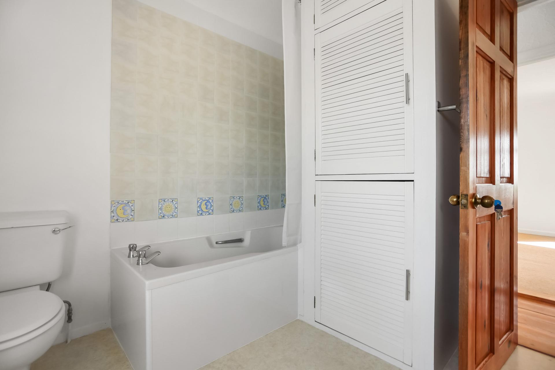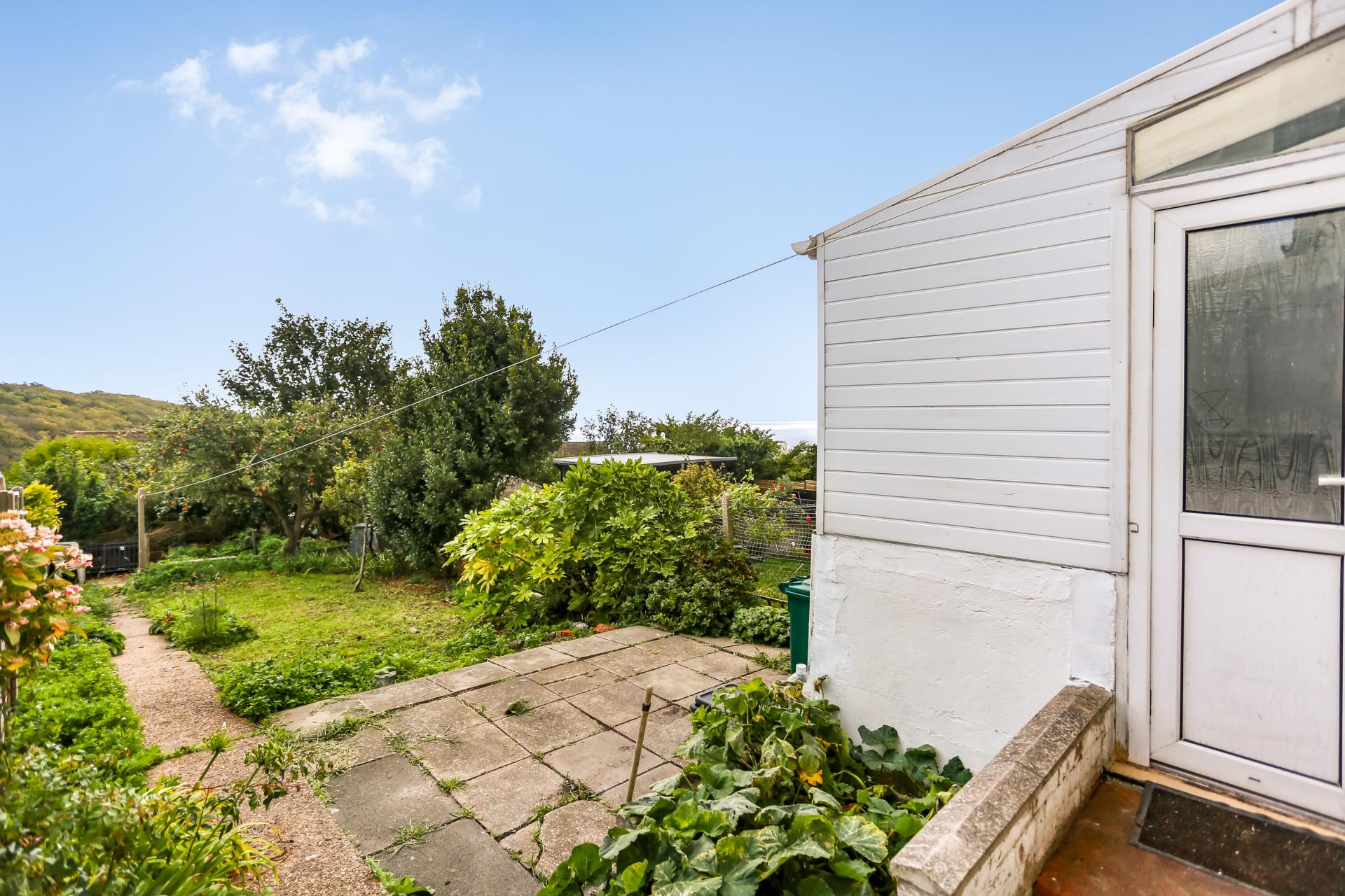 Upstairs, the master bedroom benefits from a built-in cupboard and distant sea views, accompanied by a further double bedroom. The modern bathroom includes a bath with an over-bath electric shower, along with a useful airing cupboard.