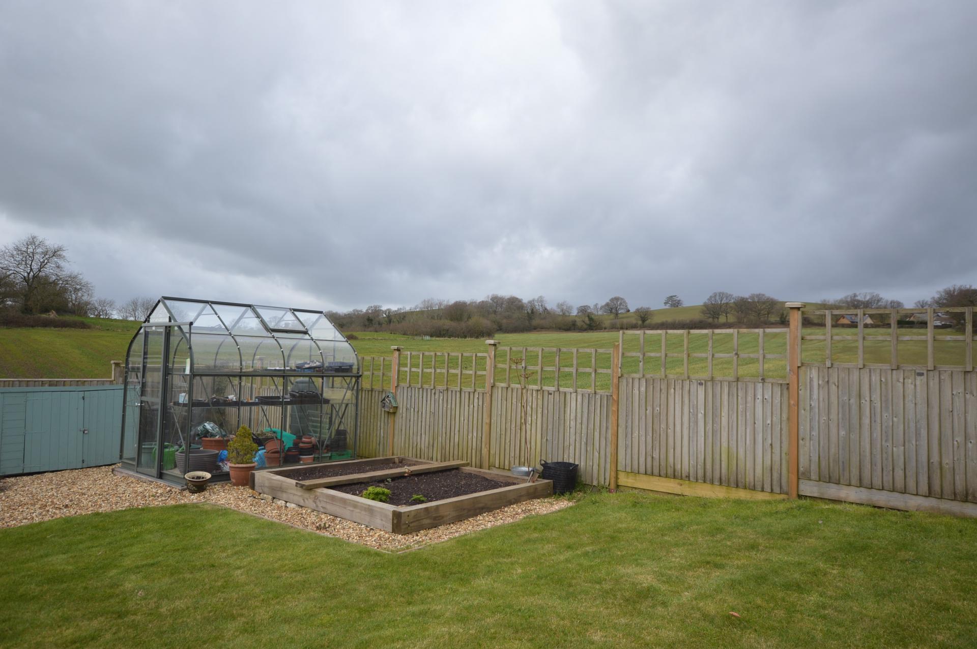 Outside to the front of the property are beds filled with shrubs and a sloped walkway leading around to the rear garden. Here you will find a generous patio, lawned area, vegetable beds and green house. Beyond the garden fence are fields and lovely views.