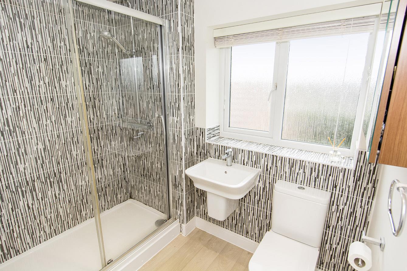 En-Suite Shower Room - Double shower cubicle with main shower fitment. Wash hand basin. Low level WC. Complimentary tiling. Heated towel rail. Wood laminate flooring. Opaque double-glazed window.