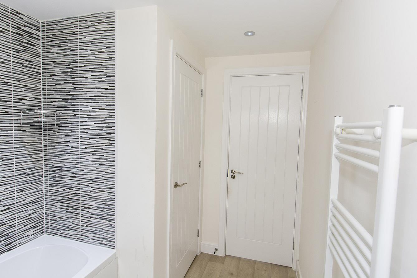 Bathroom - Panelled bath with main shower fitment over. Wash hand basin. Low level WC. Complimentary tiling. Electric shaver point. Wood laminate flooring. Heated towel rail. Airing cupboard housing lag top water tank. Opaque double-glazed window.