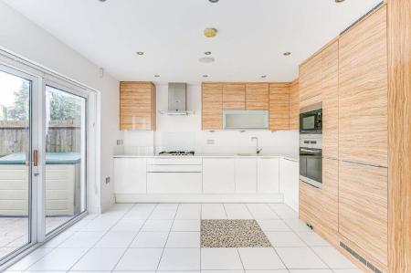 Kitchen / Diner - 4.9 x 3.7 - Rear aspect sliding patio door to garden. Range of high gloss wall and base units with composite stone work tops over. Inset stainless steel sink unit. Five ring gas hob. Built in electric oven. Built in microwave. Integrated appliances including fridge freezer, washer/dryer machine and dishwasher. Cupboard housing wall mounted gas boiler. Tiled floor with underfloor heating. Recessed ceiling spotlights.