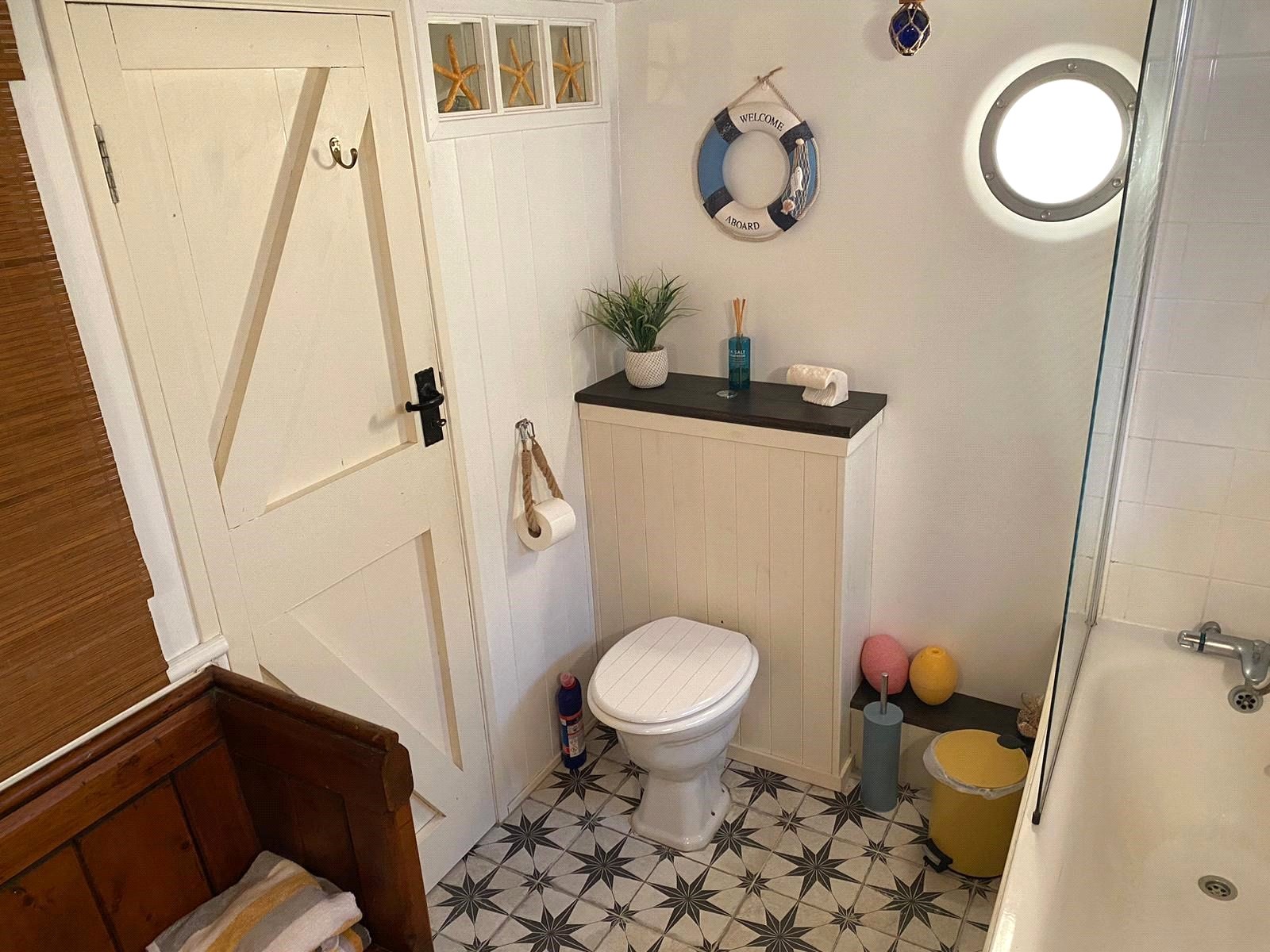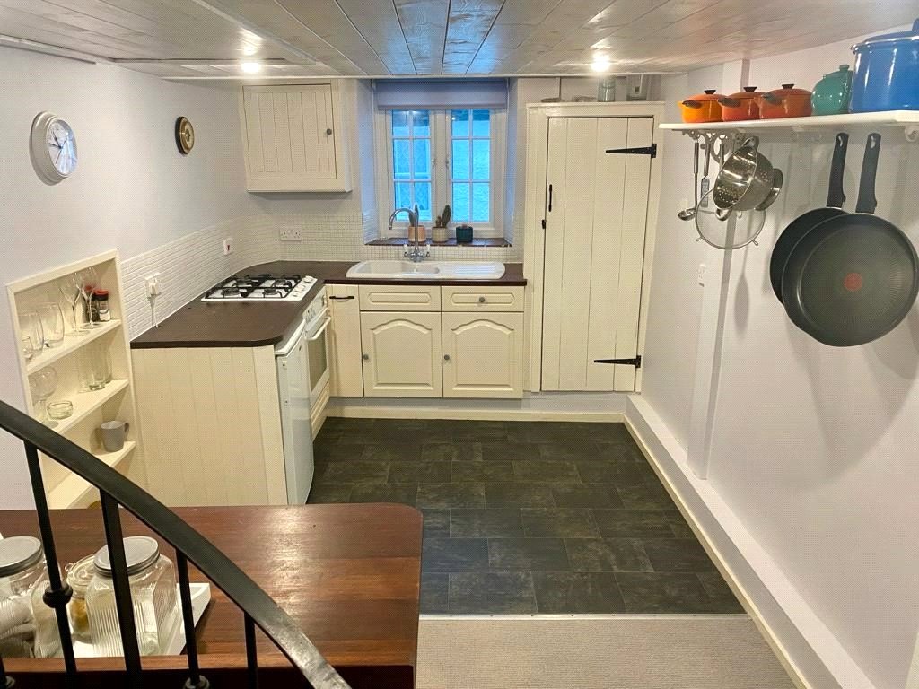 The accommodation is over 4 storeys. The ground floor is an open plan kitchen/dining room, with a lovely window seat to the front overlooking the green and painted beams with the kitchen featuring vinyl flooring, matching units and built in appliances. A spiral staircase leads down to a small lobby with a rear pedestrian door and a bathroom, which has 3 piece white suite, shower over the bath and quality tiling.
