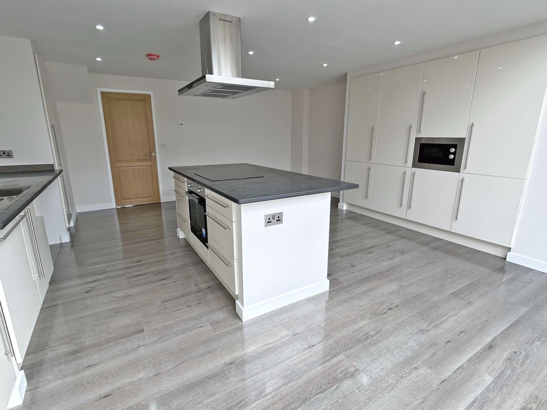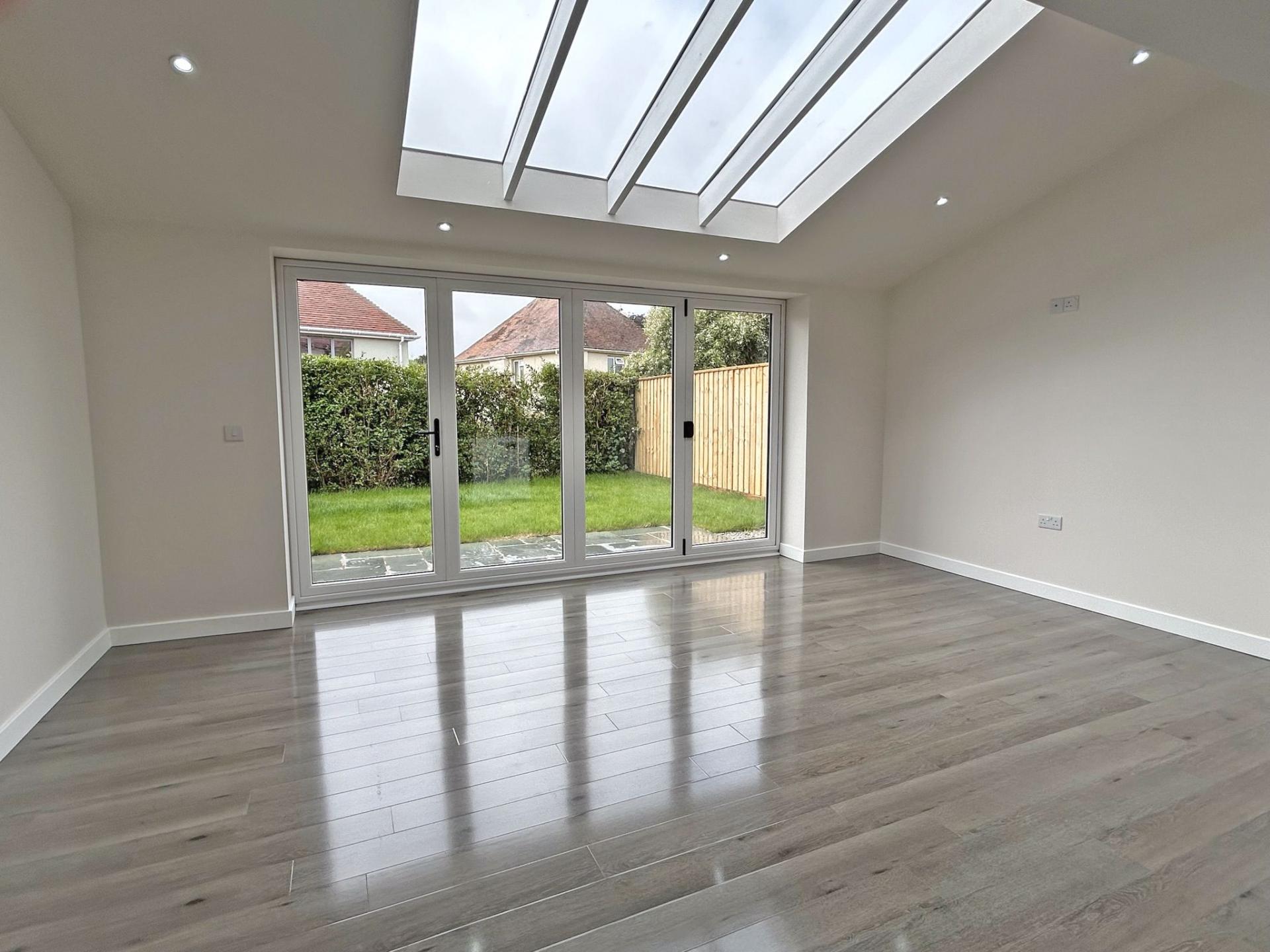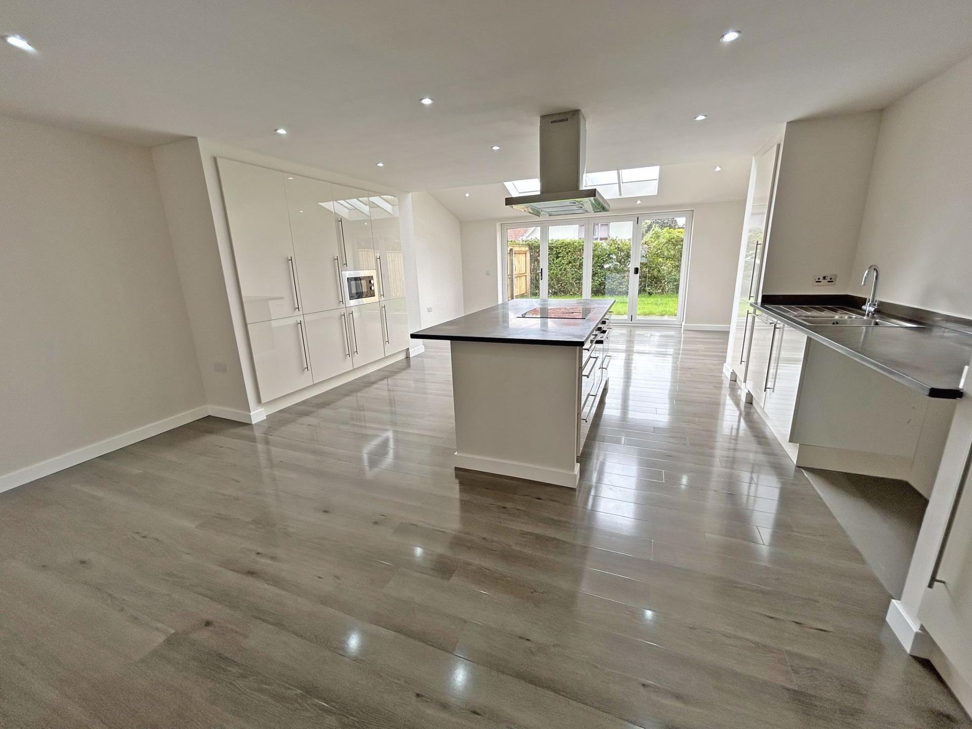 7.79m (25’06) x 5.18m (17’) Feature part vaulted glazed ceiling and bi-fold doors with outlook into the garden and enjoying a southerly aspect. Modern fitted kitchen comprising a range of floor standing and wall mounted cupboards with a cream high gloss door and drawer fronts. Stainless steel bar handles and slate worksurfaces. One and a half bowl stainless steel sink incorporating draining unit. Co- ceramic hob with stainless steel cooker hood over. Built under single electric oven. Integrated microwave, fridge/freezer and dishwasher. High gloss wood effect flooring. LED downlights. TV point. Under floor central heating stat. Cupboard containing Ideal gas fired combination boiler for central heating and hot water.