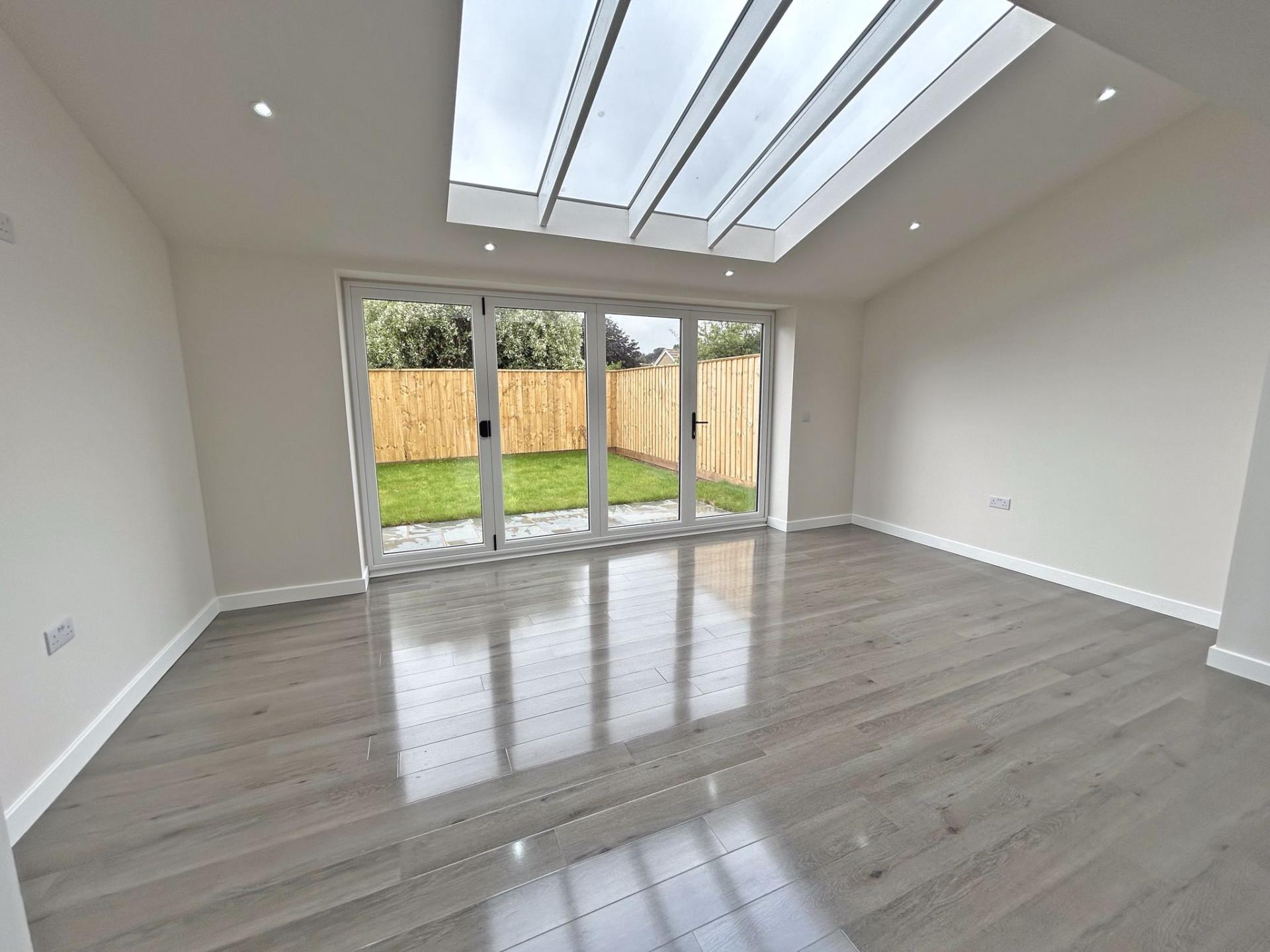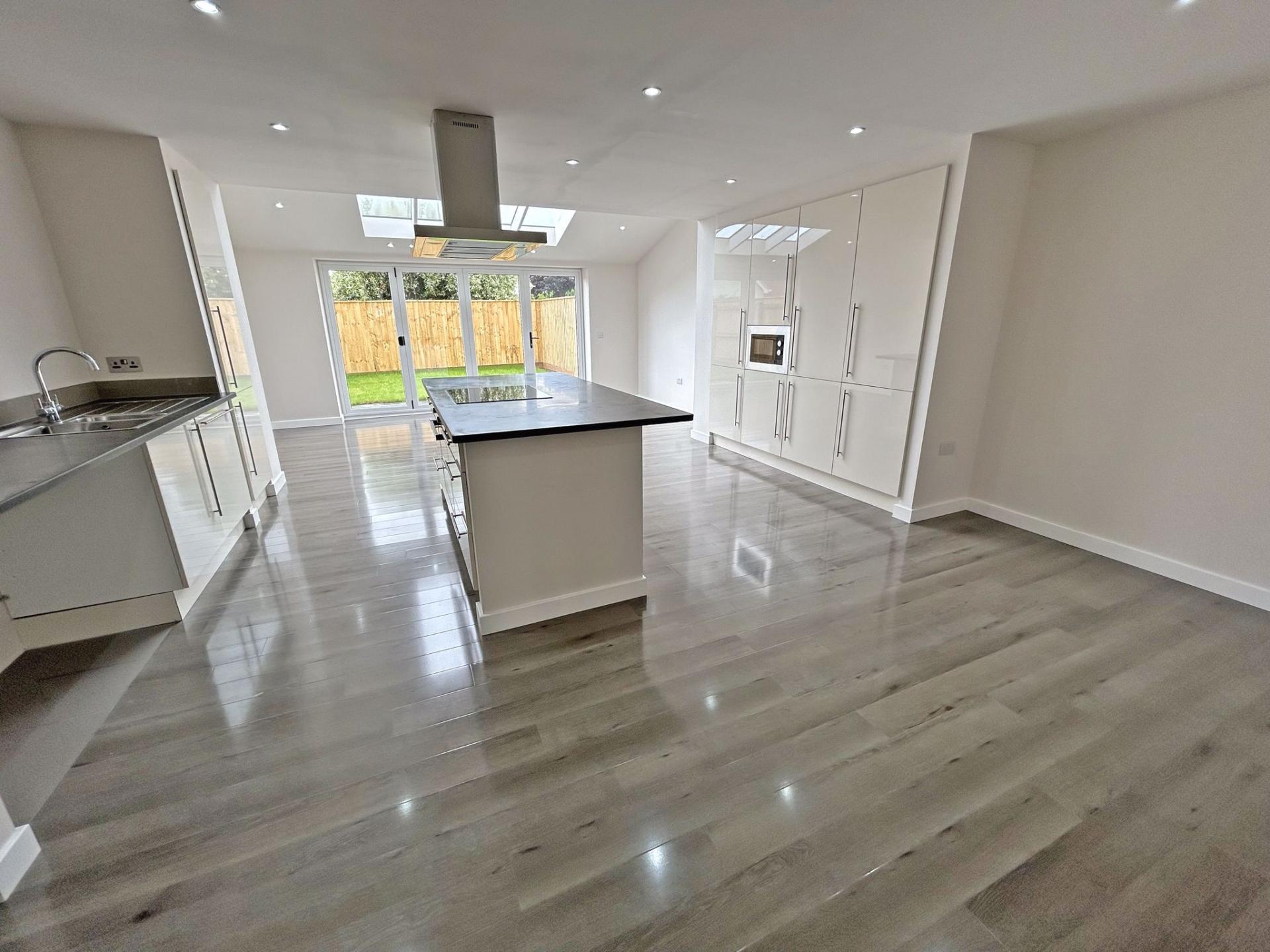 7.79m (25’06) x 5.18m (17’) Feature part vaulted glazed ceiling and bi-fold doors with outlook into the garden and enjoying a southerly aspect. Modern fitted kitchen comprising a range of floor standing and wall mounted cupboards with a cream high gloss door and drawer fronts. Stainless steel bar handles and slate worksurfaces. One and a half bowl stainless steel sink incorporating draining unit. Co- ceramic hob with stainless steel cooker hood over. Built under single electric oven. Integrated microwave, fridge/freezer and dishwasher. High gloss wood effect flooring. LED downlights. TV point. Under floor central heating stat. Cupboard containing Ideal gas fired combination boiler for central heating and hot water.