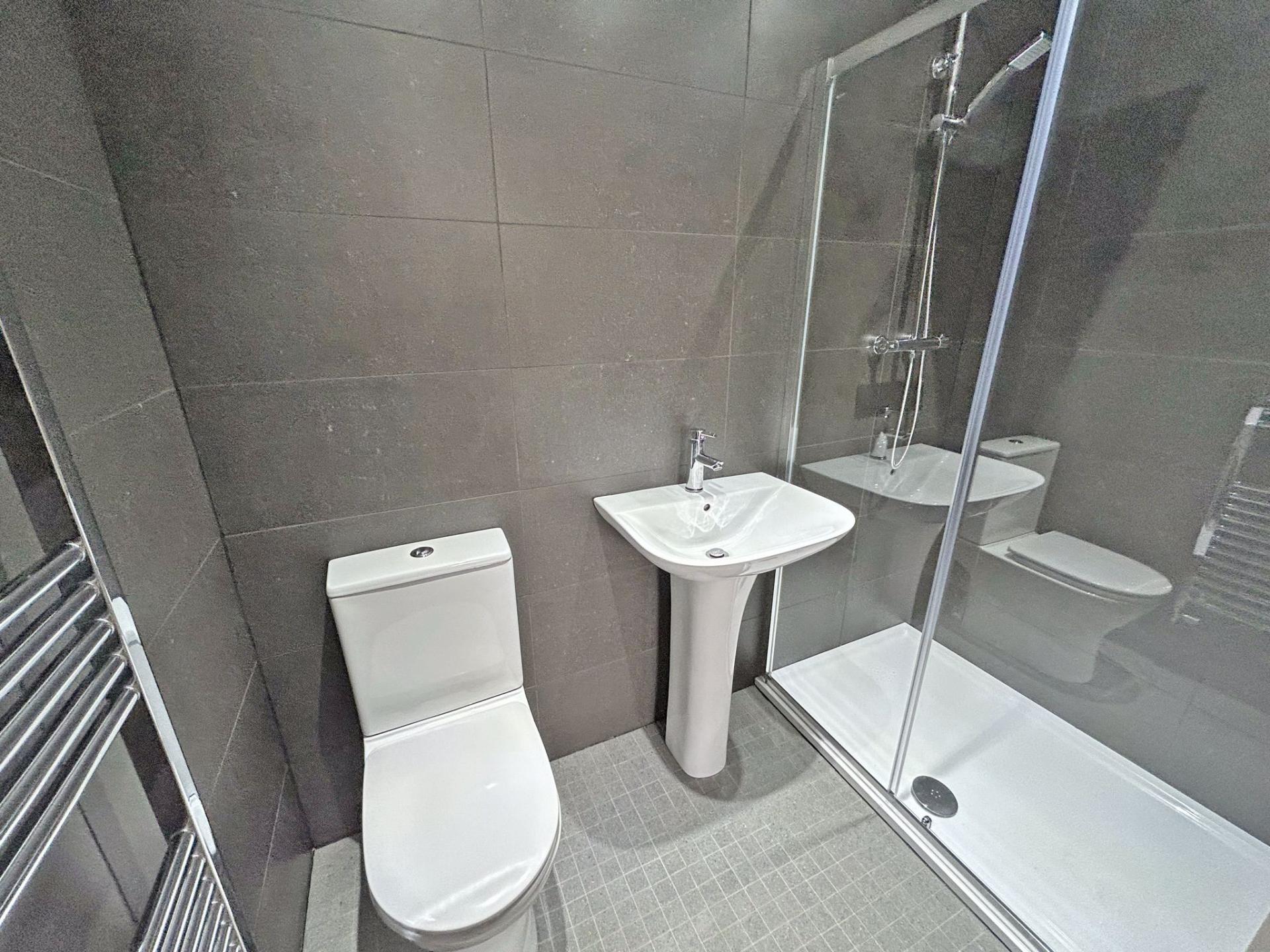 Fully tiled floor and walls to ceiling. White suite comprising WC, wash basin and pedestal. Large shower with glazed sliding door. Exposed shower mixer valve with riser. Rain style head and hand held shower rose. Chrome heated shower rail. LED downlights. Extractor.