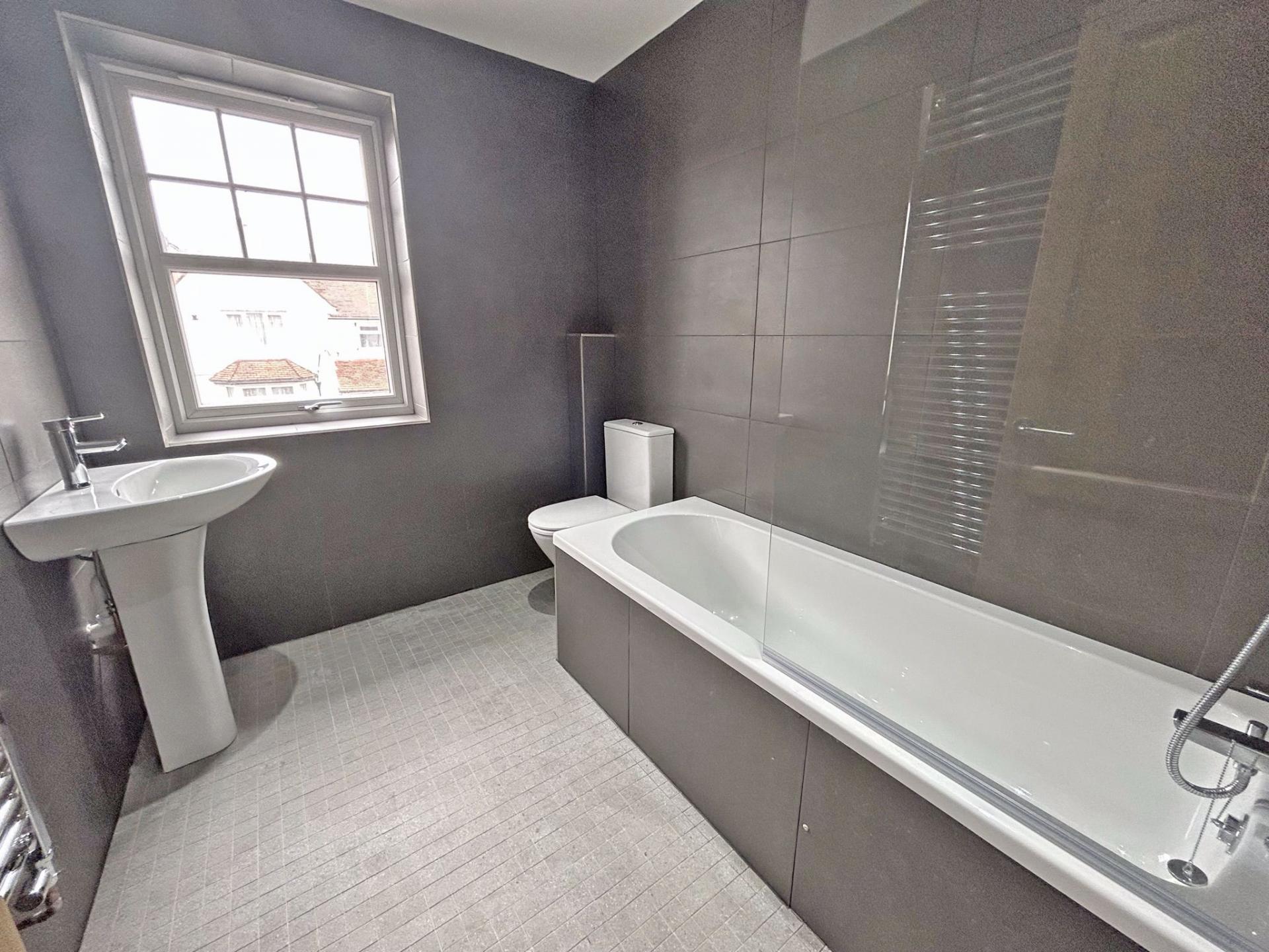 uPVC double glazed window to front aspect. Fully tiled floor and walls to ceiling. White suite comprising WC, wash basin and pedestal. Bath with tiled panel. Bath shower mixer tap with riser and rose. Glazed shower screen. LED downlights. Extractor. Chrome heated towel rail.