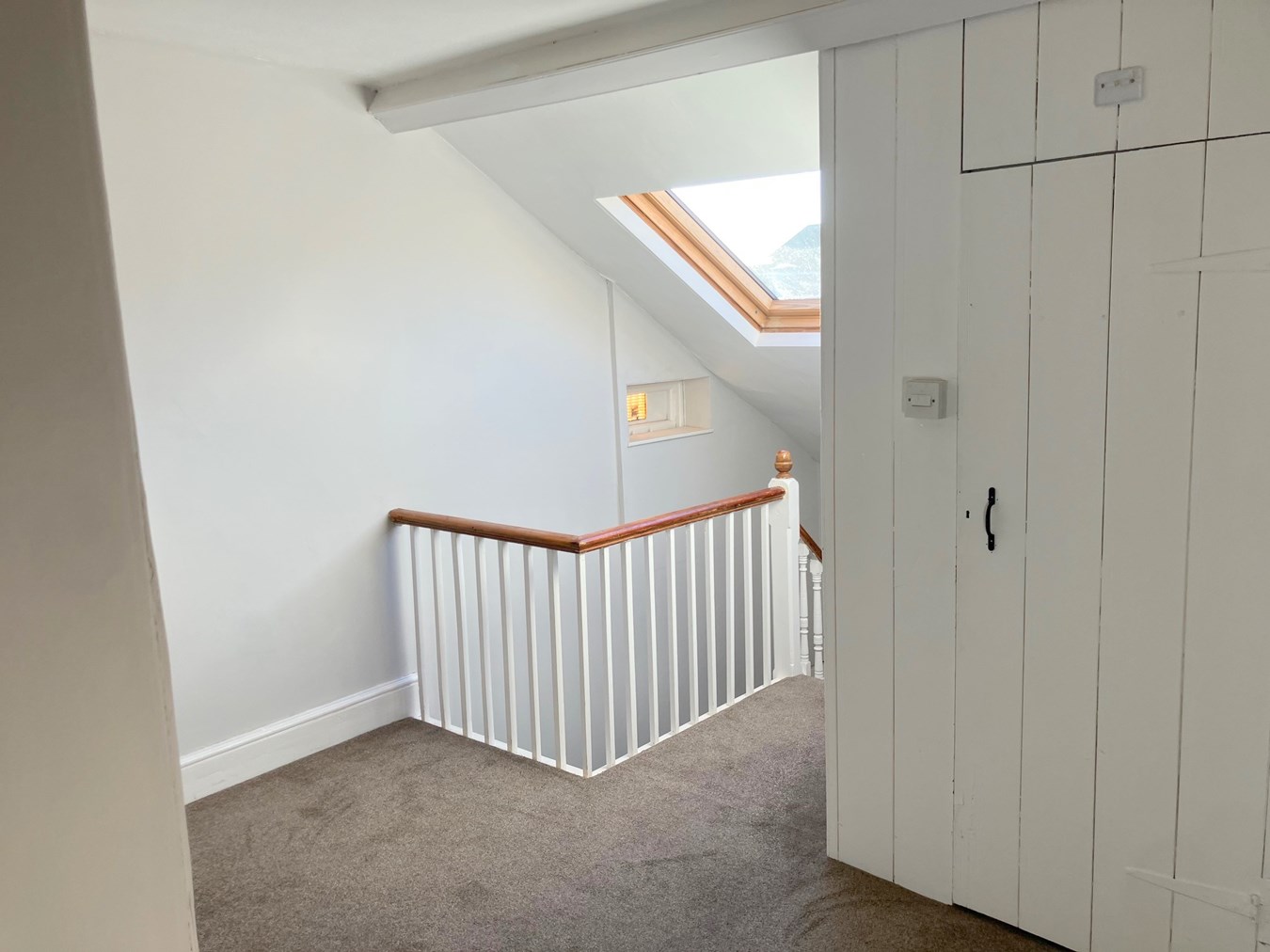 Stairs rising to a three quarter landing with a Velux window over. Stairs rising to:-