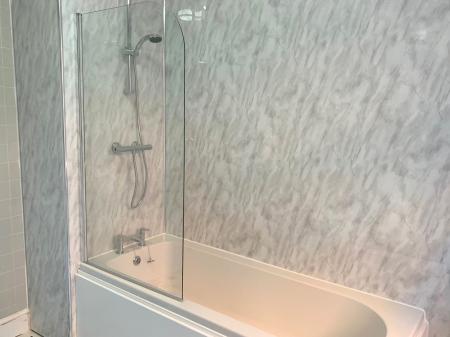 Pine panelled cast bath with shower and shower curtain over. Pedestal wash hand basin. WC. Radiator. Fully tiled walls. Storage niches. uPVC double glazed sash window to the side elevation.