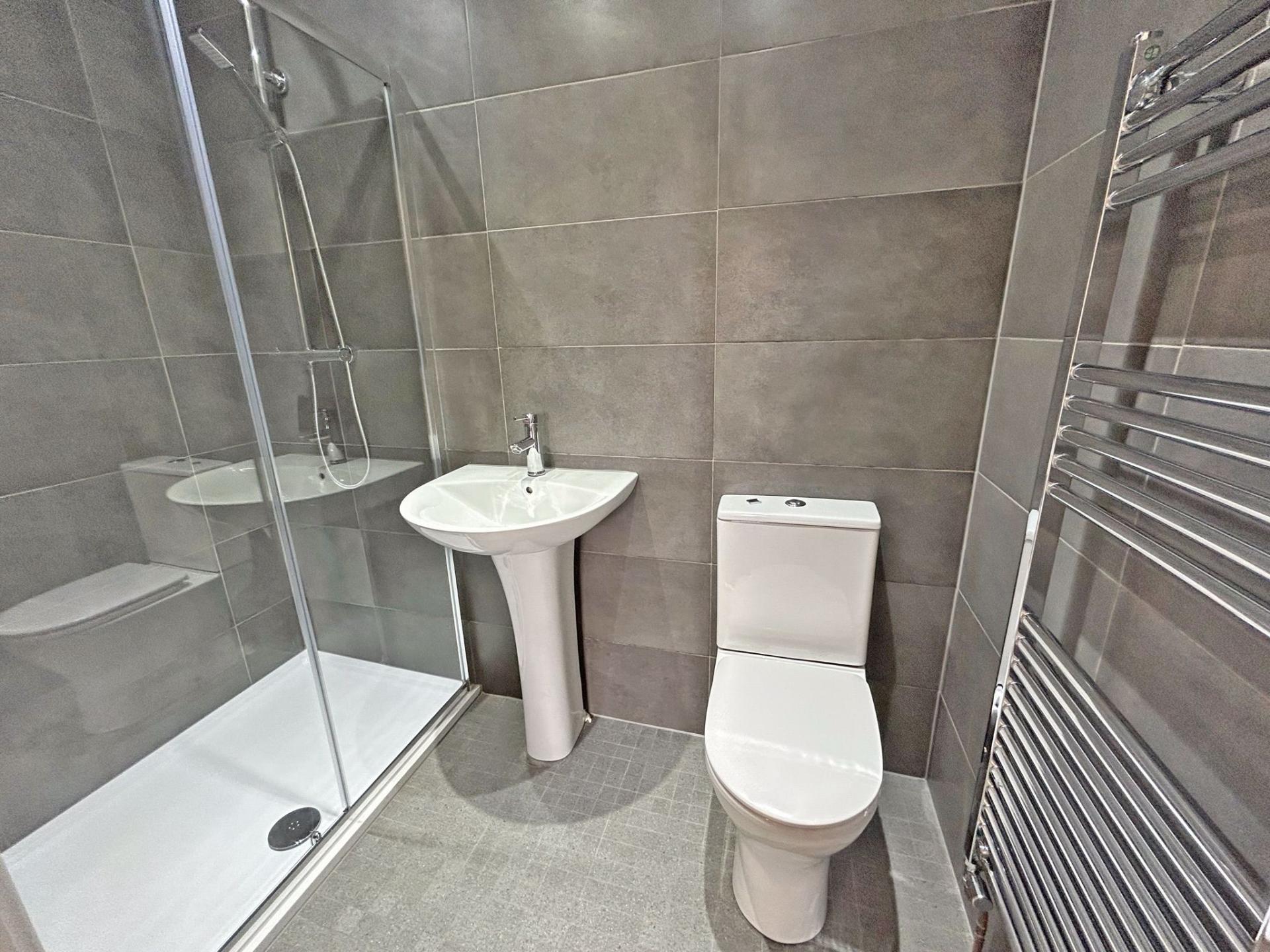 Fully tiled floor and walls to ceiling. White suite comprising WC, wash basin and pedestal. Large shower with glazed sliding door. Exposed shower mixer valve with riser. Rain style head and hand held shower rose. Chrome heated shower rail. LED downlights. Extractor.