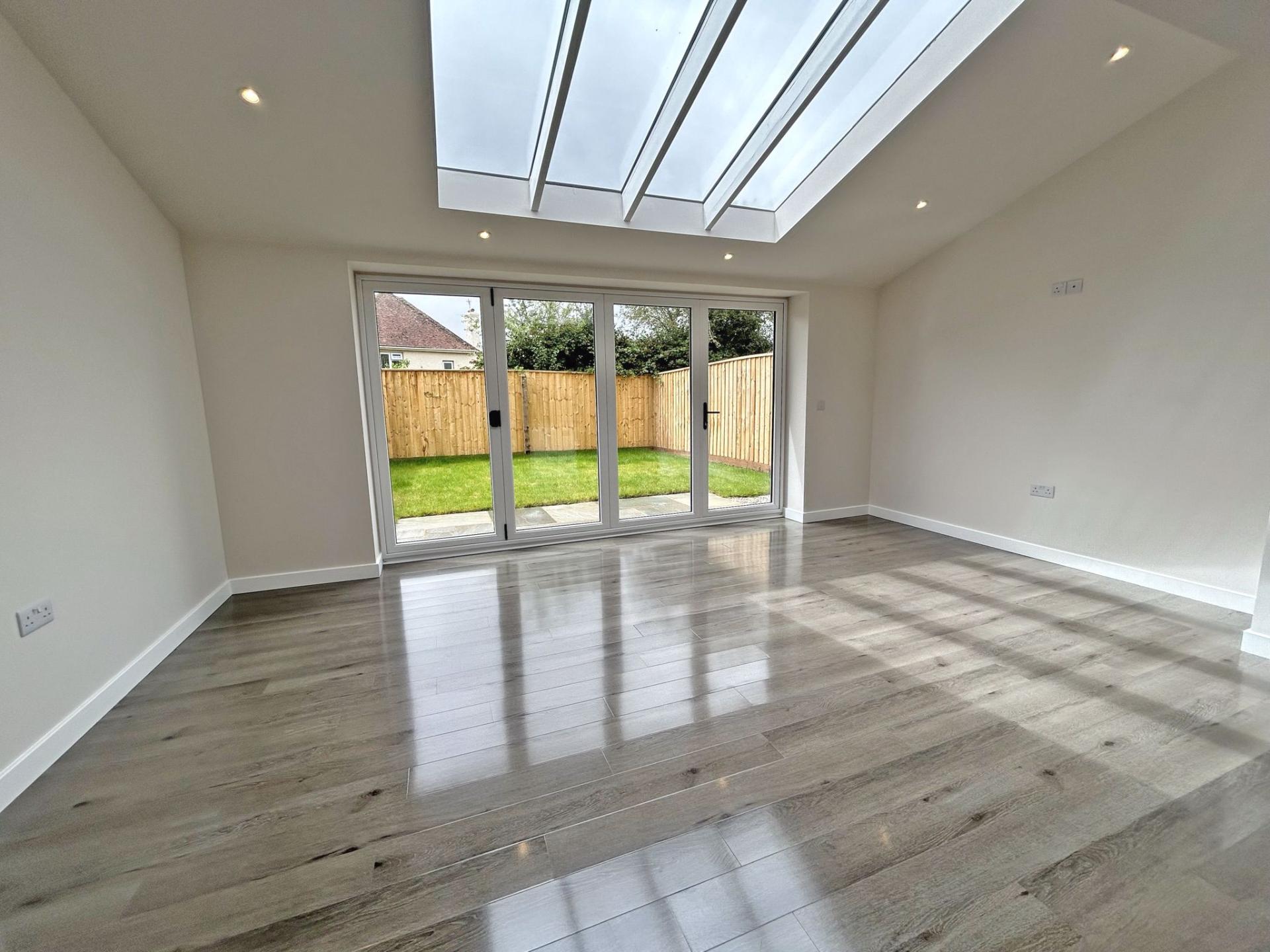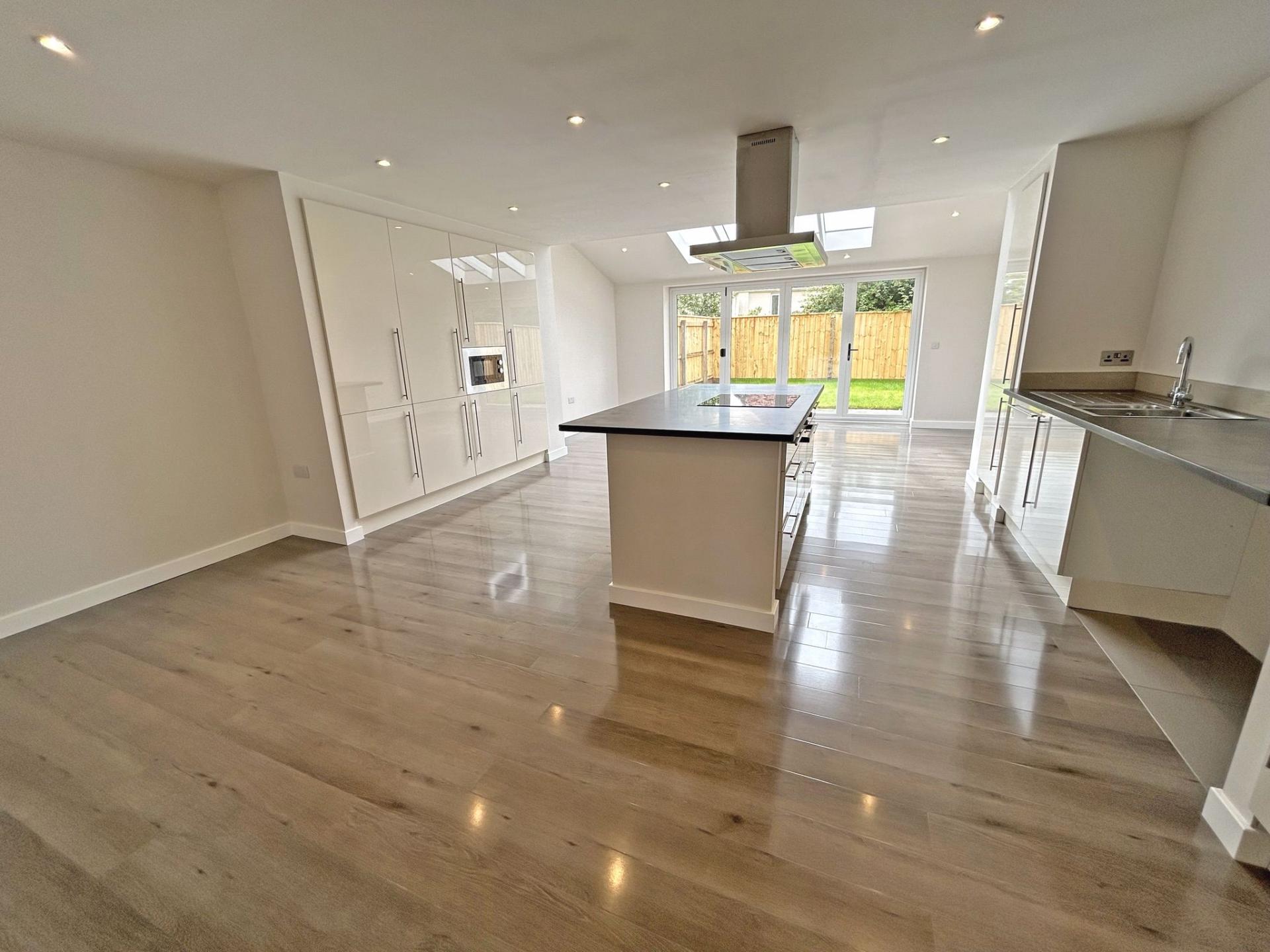 7.79m (25’06) x 5.18m (17’) Feature part vaulted glazed ceiling and bi-fold doors with outlook into the garden and enjoying a southerly aspect. Modern fitted kitchen comprising a range of floor standing and wall mounted cupboards with a cream high gloss door and drawer fronts. Stainless steel bar handles and slate worksurfaces. One and a half bowl stainless steel sink incorporating draining unit. Co- ceramic hob with stainless steel cooker hood over. Built under single electric oven. Integrated microwave, fridge/freezer and dishwasher. High gloss wood effect flooring. LED downlights. TV point. Under floor central heating stat. Cupboard containing Ideal gas fired combination boiler for central heating and hot water.