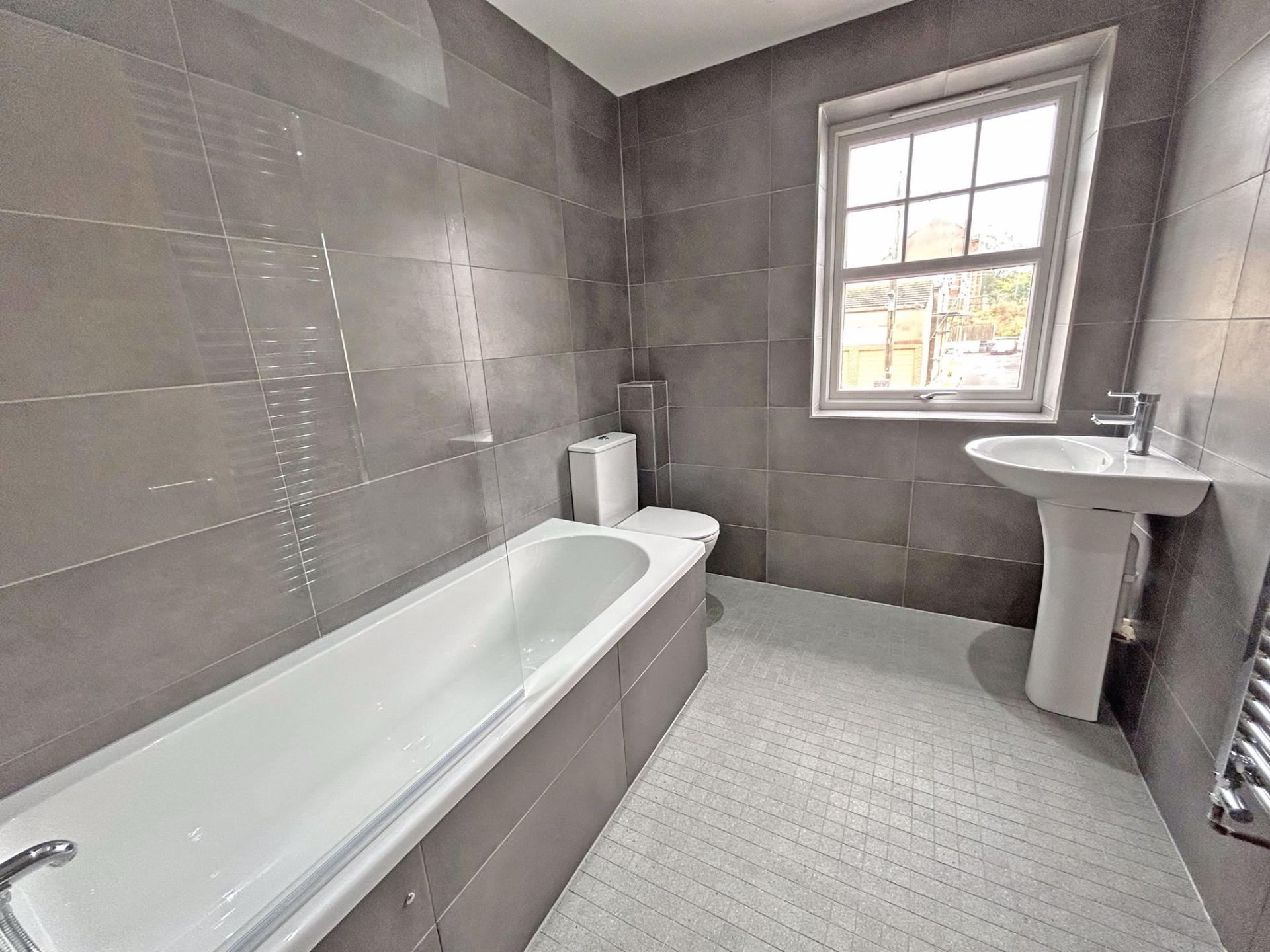 uPVC double glazed window to front aspect. Fully tiled floor and walls to ceiling. White suite comprising WC, wash basin and pedestal. Bath with tiled panel. Bath shower mixer tap with riser and rose. Glazed shower screen. LED downlights. Extractor. Chrome heated towel rail.