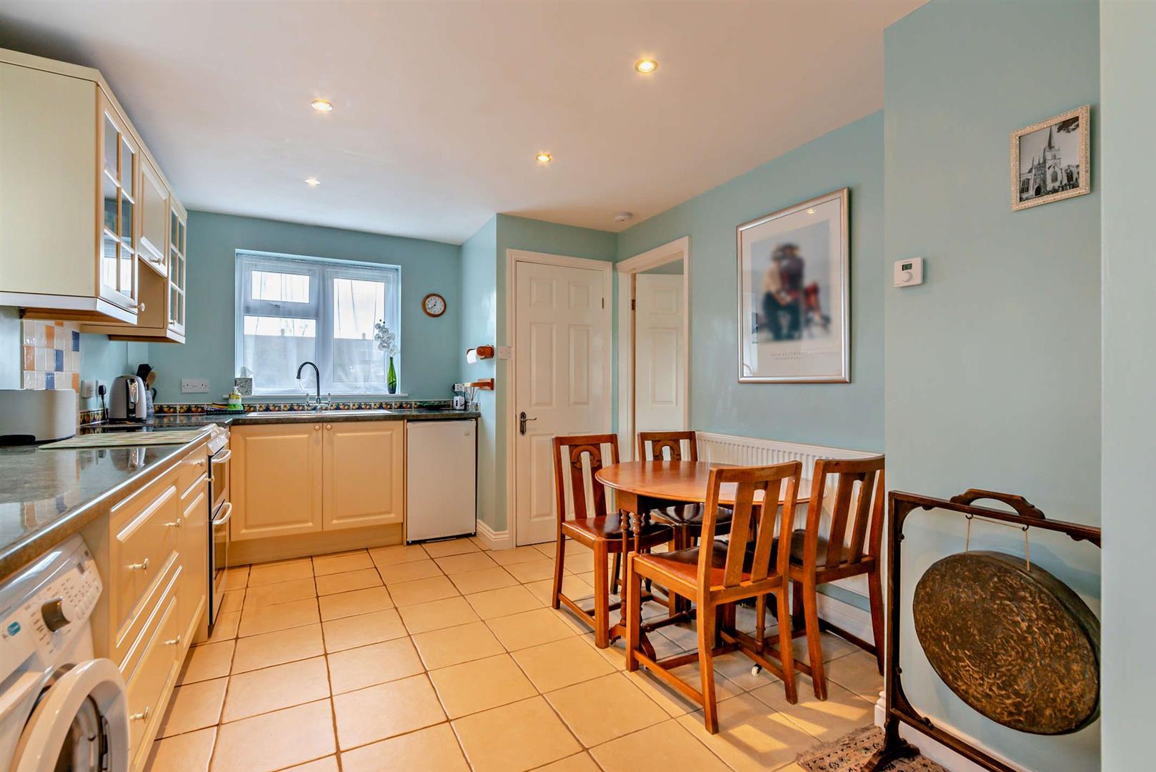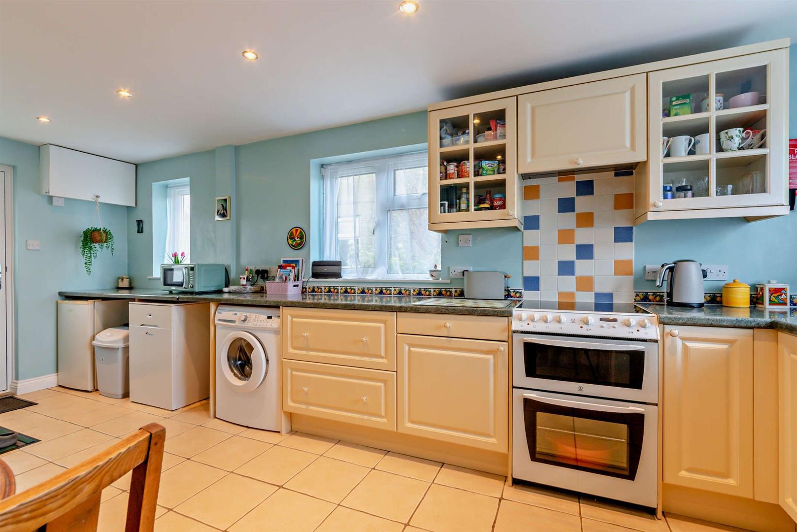 The property itself is bright and airy, with welcoming colours of pastel blue and yellow, creating for a light atmosphere. The living room is cosy with views out to the front garden. The two bedrooms are both comfortable doubles with closet/wardrobe space, and the third can be used as an office or additional storage. The family bathroom can be found on the first floor.