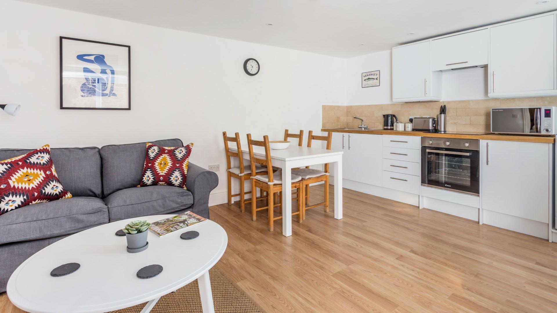 Property Information - Entering through a large patio door, you will find a modern open plan living area with a well-equipped kitchen diner and lounge. This space is light and airy thanks to an additional full length window next to the kitchen space. There is a cosy two-seater sofa with coffee table and a flat screen TV. The dining table can accommodate four, should you have guests join you for dinner.