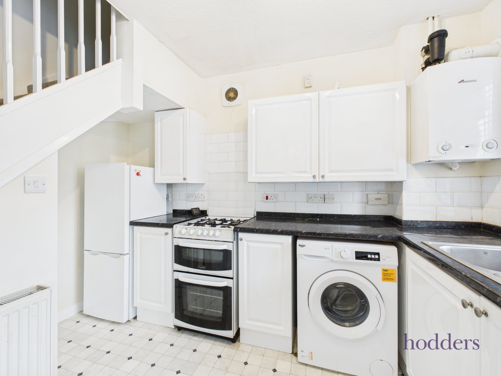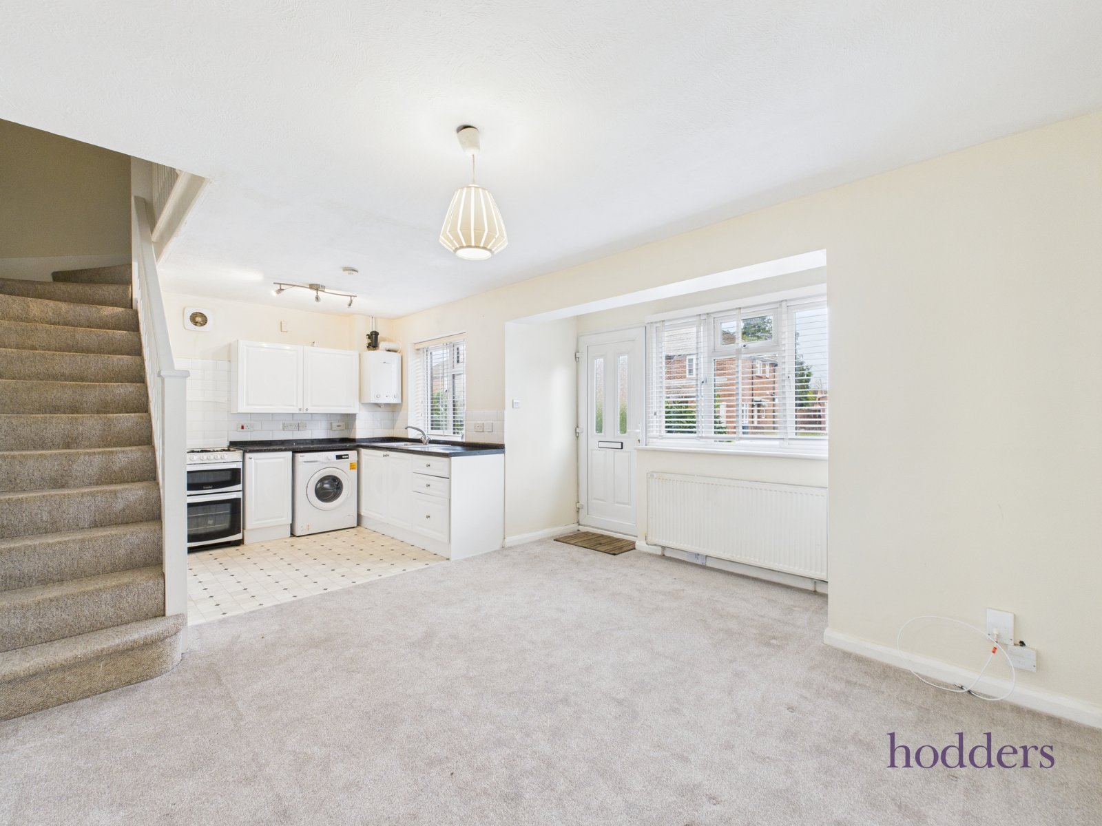 This sizeable one bedroom house is ideally situated on a quiet cul-de-sac, just a short walk to local shops and amenities. The ground floor consists of an open plan living room and modern fitted kitchen with base and eye level units, space for cooker, fridge/freezer and washing machine. On the first floor, is a three piece family bathroom suite with floor to ceiling tiles and heated chrome towel rail and double bedroom with storage cupboard over the stairs and a built in wardrobe. Outside there is a storage cupboard, priavte patio and an allocated parking space. This home is centrally located within the heart of the village and walking distance of all the local shopping facilities and local pubs. Available unfurnished.
