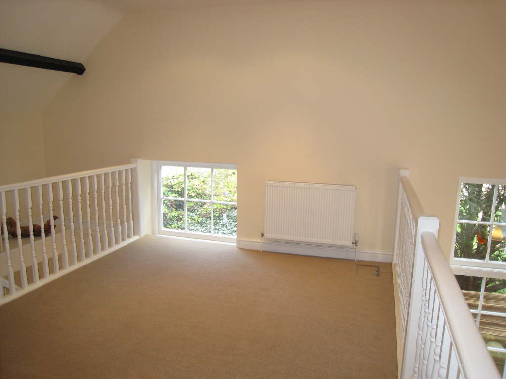 A lovely open plan room with a high vaulted ceiling to mezzanine area. Two double glazed windows to side and two double glazed windows to rear, attractive fireplace with slate hearth and log burning stove, television and telephone point, under stairs cupboard, two reclaimed radiators, rustic oak laminate flooring, French doors to garden.
