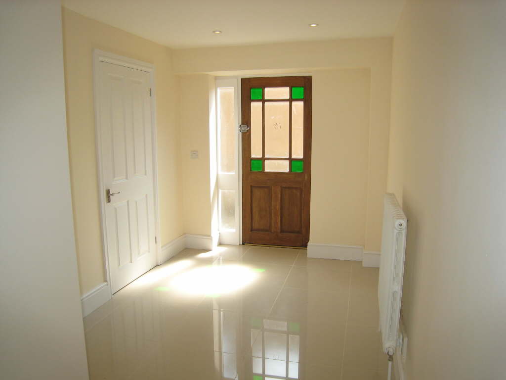 Spacious hallway, recessed spot lights, two large storage cupboards one housing wall mounted gas boiler supplying hot water and central heating, reclaimed radiator, porcelain glazed tiled flooring, stairs rising to first floor, panelled doors to guest cloakroom and living/dining room, hardwood stable door to courtyard garden, door to garage.