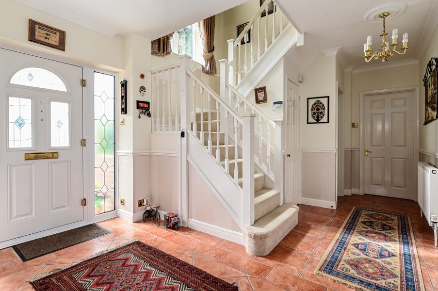 An exceptional five bedroom detached house situated at the end of a cul-de-sac on a plot of approx. 0.29 acre within close proximity to Tomlinscote, Ravenscote and Prior Heath schools. Ground floor accommodation comprises living room, dining room, study, family room, conservatory, utility room and re-fitted kitchen/breakfast room. On the first floor are five bedrooms, two with en-suites plus a further shower room. Externally there is a large driveway providing off street parking for several vehicles plus detached double garage with electrically operated door. The rear garden is very private and measures approx. 120ft by 95ft, is mainly lawned with mature flowers, shrubs plus vegetable patch.