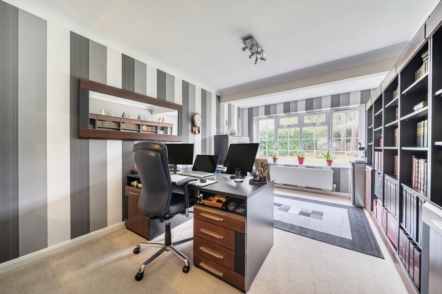Tucked away in one of Camberley’s most exclusive residential enclaves, this detached residence occupies a generous corner plot of 0.28 Acres, and provides accommodation approaching 2,600 SQ FT. The entrance hall opens to a well-proportioned living room, with sliding doors leading to the rear garden. The orangery is flooded with natural light, through a sky lantern, and large windows over looking the rear garden, a serene, sunlit space perfect for morning coffee, quiet reading, or evening relaxation with the garden as your backdrop. The kitchen and breakfast room form the heart of this home, a bright, sociable space ideal for family gatherings or casual dining. Fitted with ample eye and base level storage, and granite worksurfaces. A separate utility room keeps day-to-day life organised, while the adjoining garage provides additional convenience and storage. This home offers incredible flexibility, with two ground-floor bedrooms that can easily serve as a guest suite, home office, or playroom, whichever best suits your lifestyle. Heading upstairs, the principal suite is a luxurious retreat, complete with a dressing room and en-suite. Three further bedrooms and a modern family bathroom provide comfort for the whole family. Cleverly designed eaves storage adds practicality without compromising on aesthetics. To the front, a private driveway provides generous parking and access to a double garage. The rear garden is a peaceful oasis — ideal for al fresco dining, family barbecues, or simply enjoying the quiet of this leafy, sought-after setting. Set in the prestigious Walkers Ridge area, this home offers the best of both worlds: a tranquil residential location within easy reach of Camberley town centre, train station, and highly regarded local schools. With the M3 and A30 close by, commuting and weekend escapes are effortless.