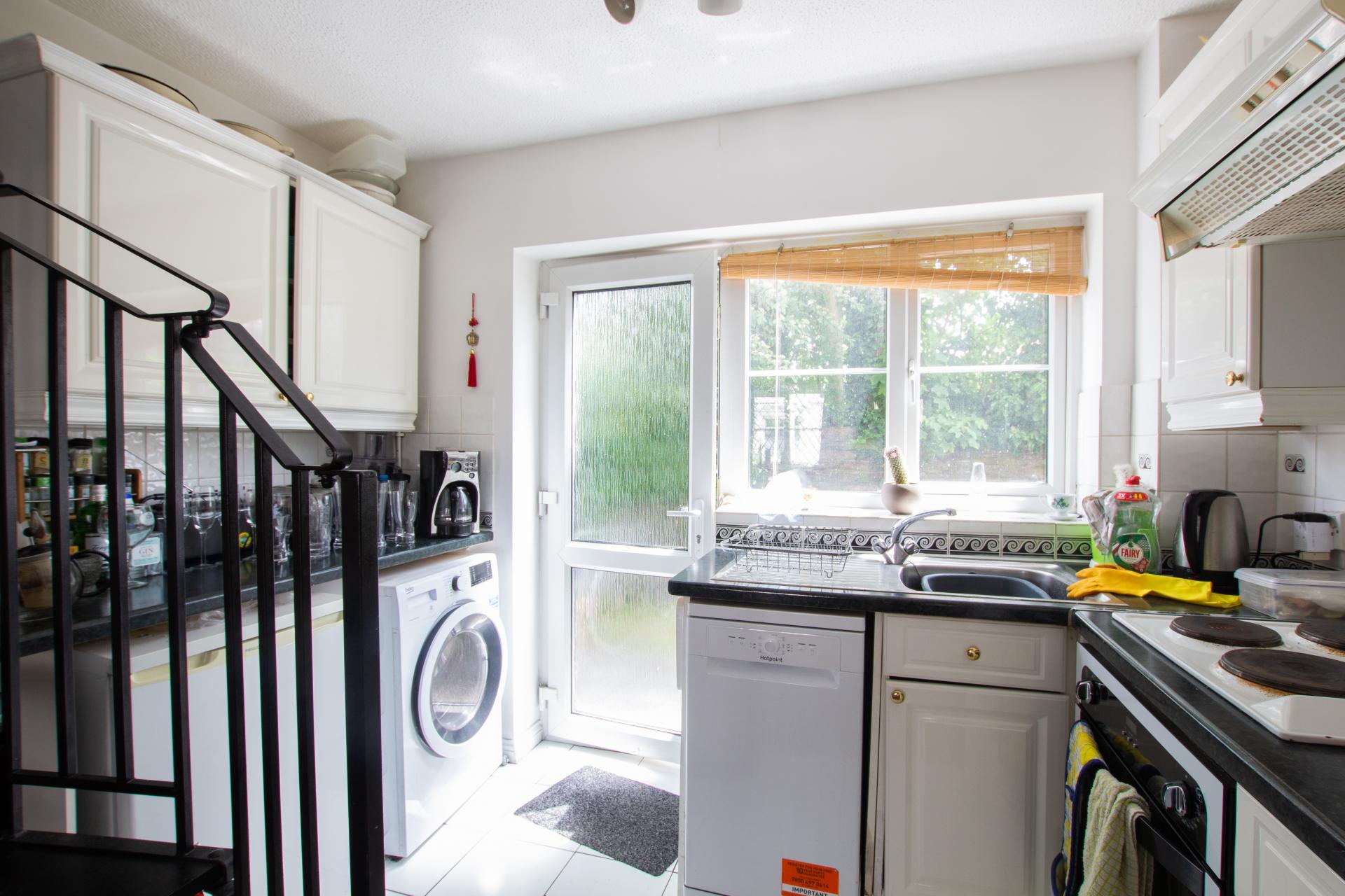Front door leads through into an open plan reception/kitchen area complete with fitted storage cupboard, dual aspect windows, door to the garden, and a range of kitchen units and electric oven, hob, fridge/freezer and washer dryer. Stairs lead to the main bedroom which is a bright double room with fitted wardrobes and access to the main bathroom which is complete with shower over bath, basin and WC, plus airing cupboard.