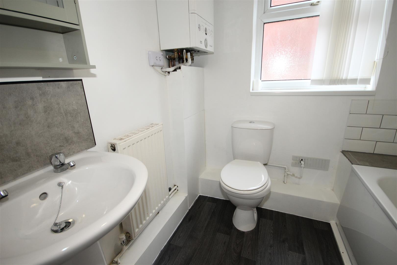 Bathroom - 1.85 x 1.88 (6'0" x 6'2") - The bathroom comprises a low-flush WC, pedestal wash hand basin, and a panelled bath with plumbed-in shower and screen over, complemented by a tiled surround, coved ceiling, extractor fan, and a rear-facing UPVC frosted window.