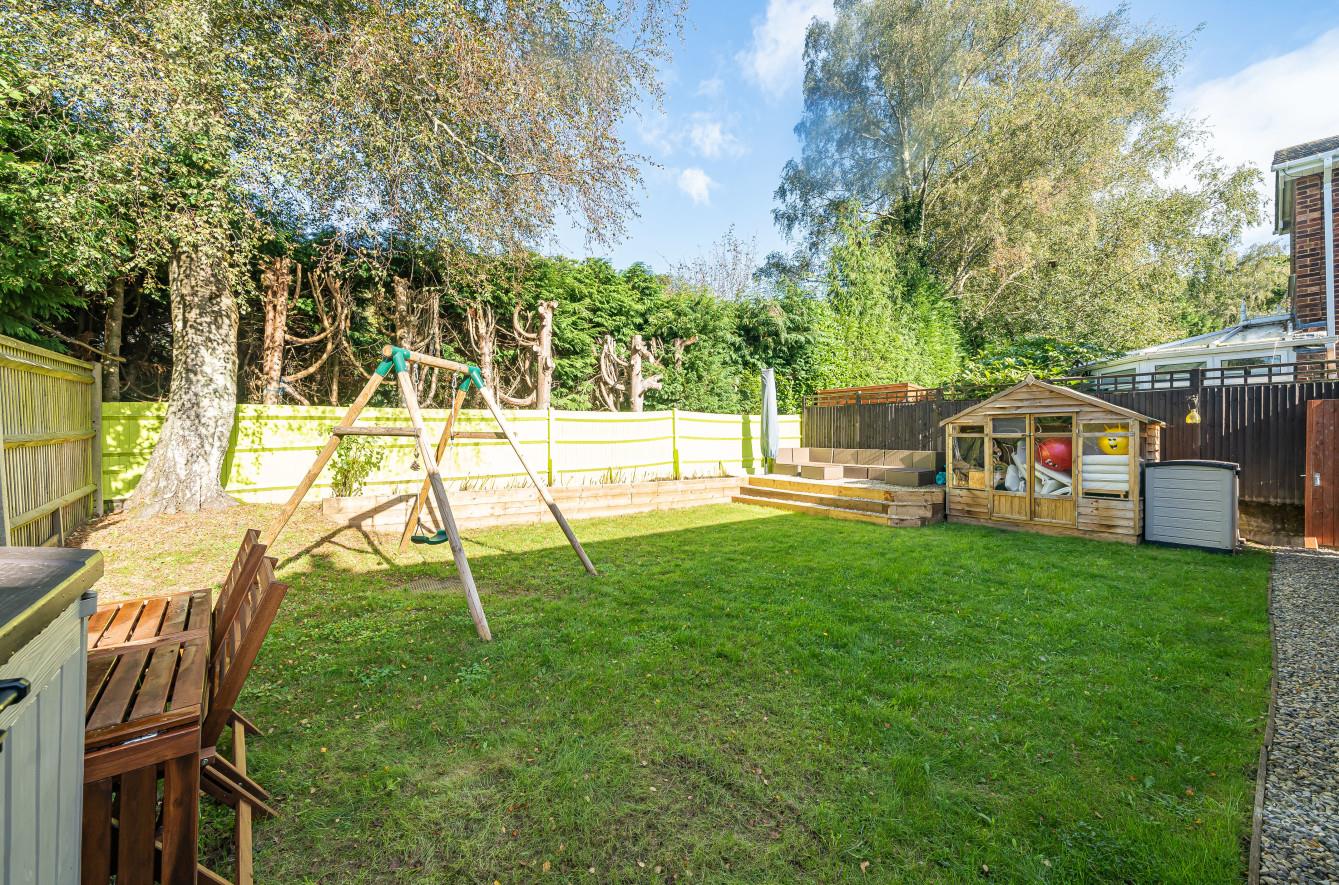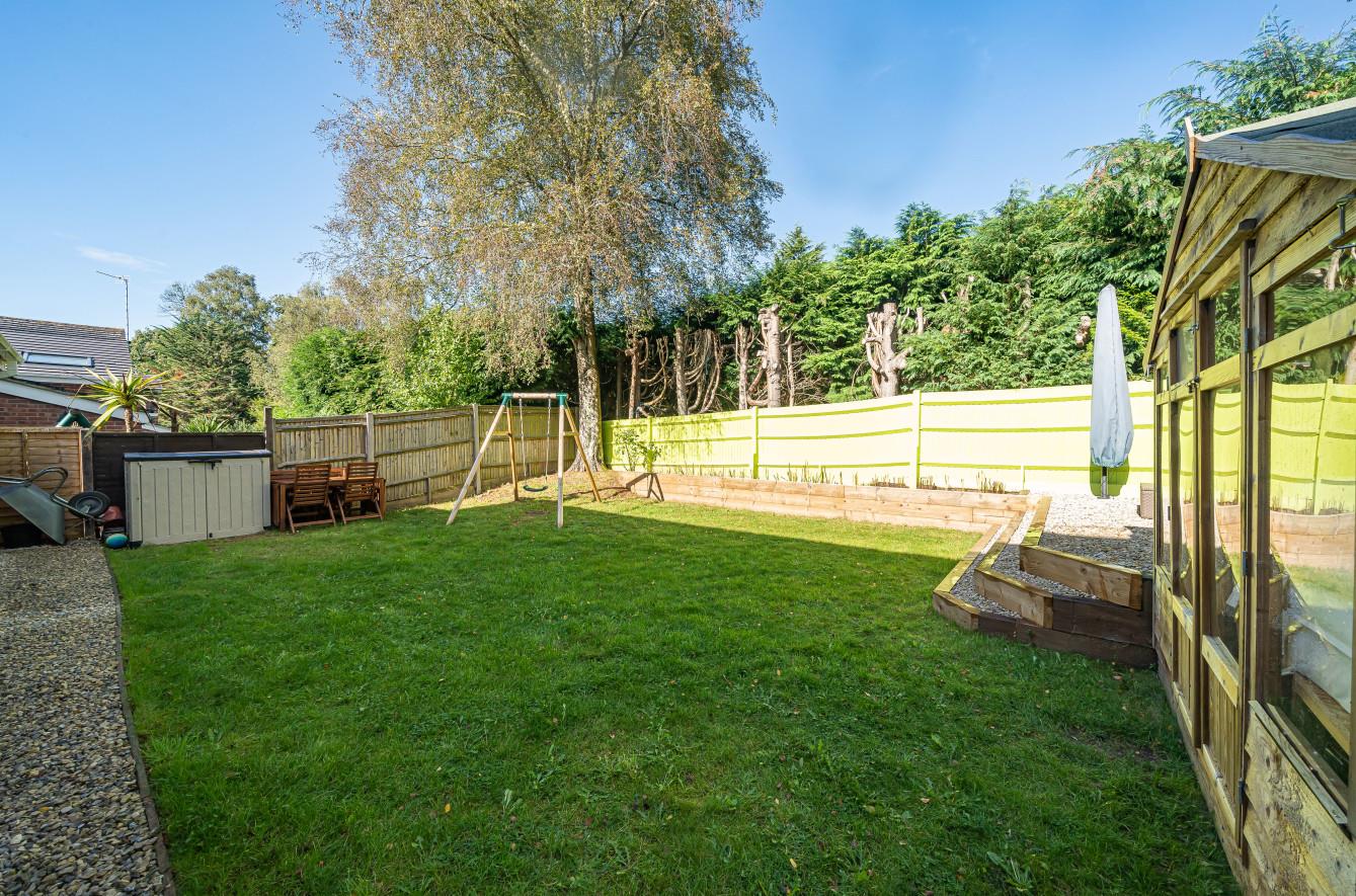 Rear Garden: - Measures approximately 41' x 31' Laid to lawn, gravel path, sleeper wall / plant bed, steps up to raised seating area, shed/summer house, access to side of the property to shed.