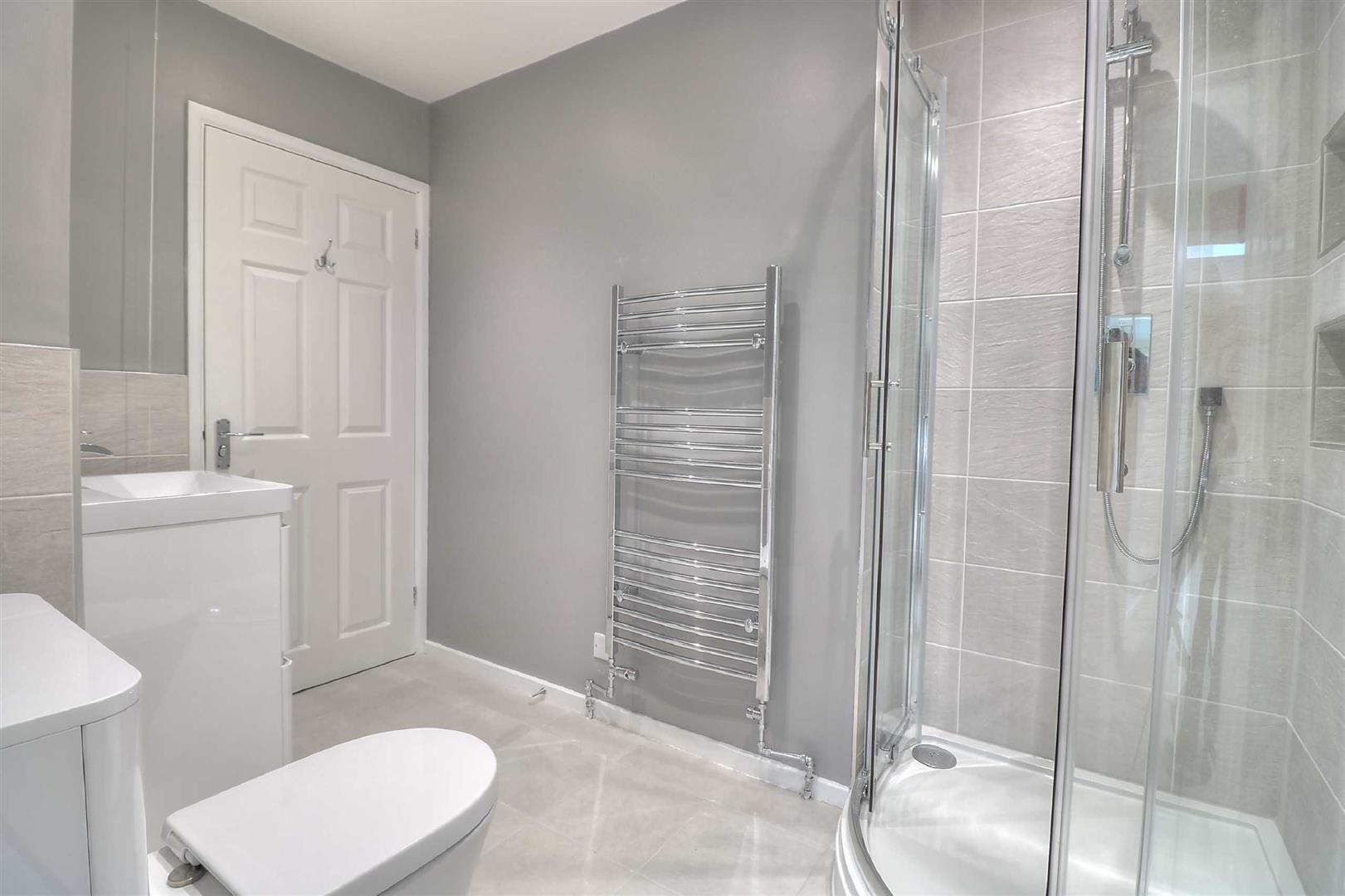 Shower Room: - White suite with chrome fitments comprising shower cubicle, wash basin with drawer under.