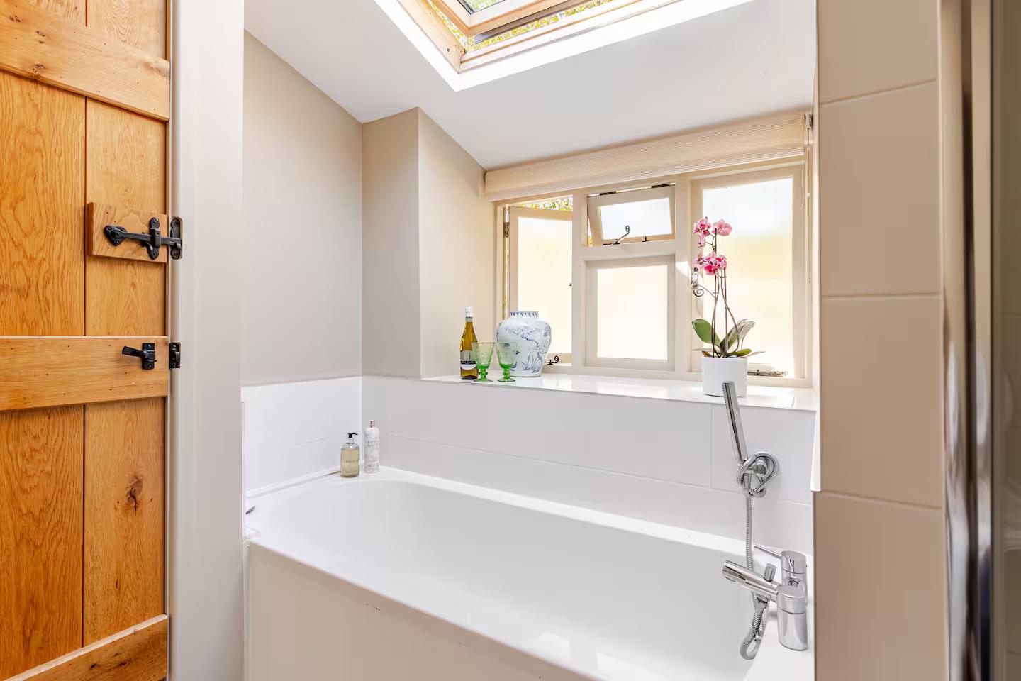 Adjacent, the open-plan kitchen and dining area is filled with natural light, overlooking fruit trees on the drive. The contemporary kitchen is well-equipped with a double electric oven, induction hob, fridge/freezer, dishwasher, microwave, and coffee facilities. A wooden dining table for four provides an intimate setting for meals or socialising. Complementing the kitchen is a separate utility room, fitted with a washing machine and tumble dryer, providing practical additional storage and keeping day-to-day laundry neatly out of sight.