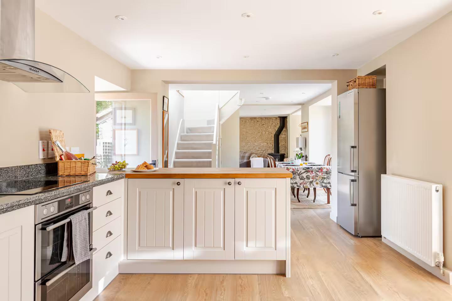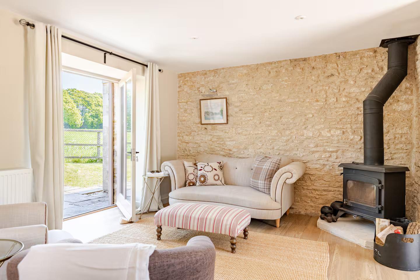 Upon entering, you are welcomed into a bright lobby leading to the dual-aspect living room. Featuring an exposed Cotswold stone wall and a cosy wood-burning stove, this inviting space offers a two-seater sofa, four armchairs, and a Smart TV. The room is perfect for relaxing with a book or enjoying board games by the fire.