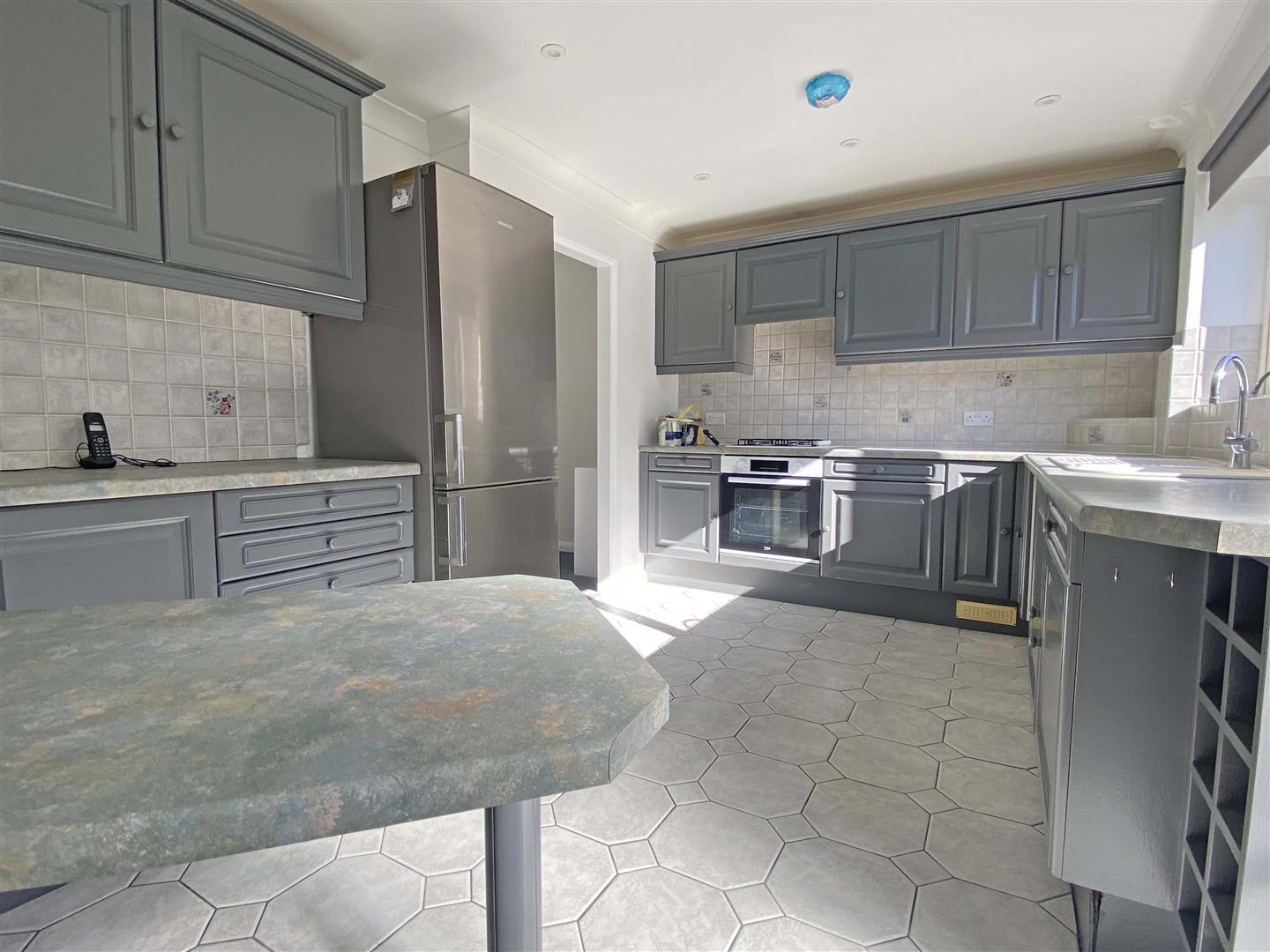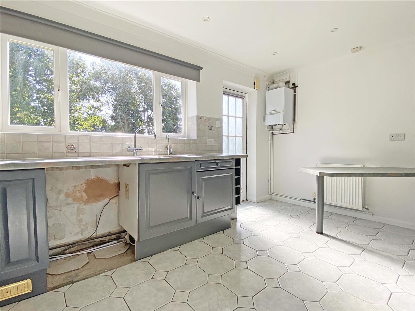 Double glazed window and door to rear, range of wall and base units, rolled edge work surfaces with stainless steel sink inset, integrated low level oven, hob with extractor over.