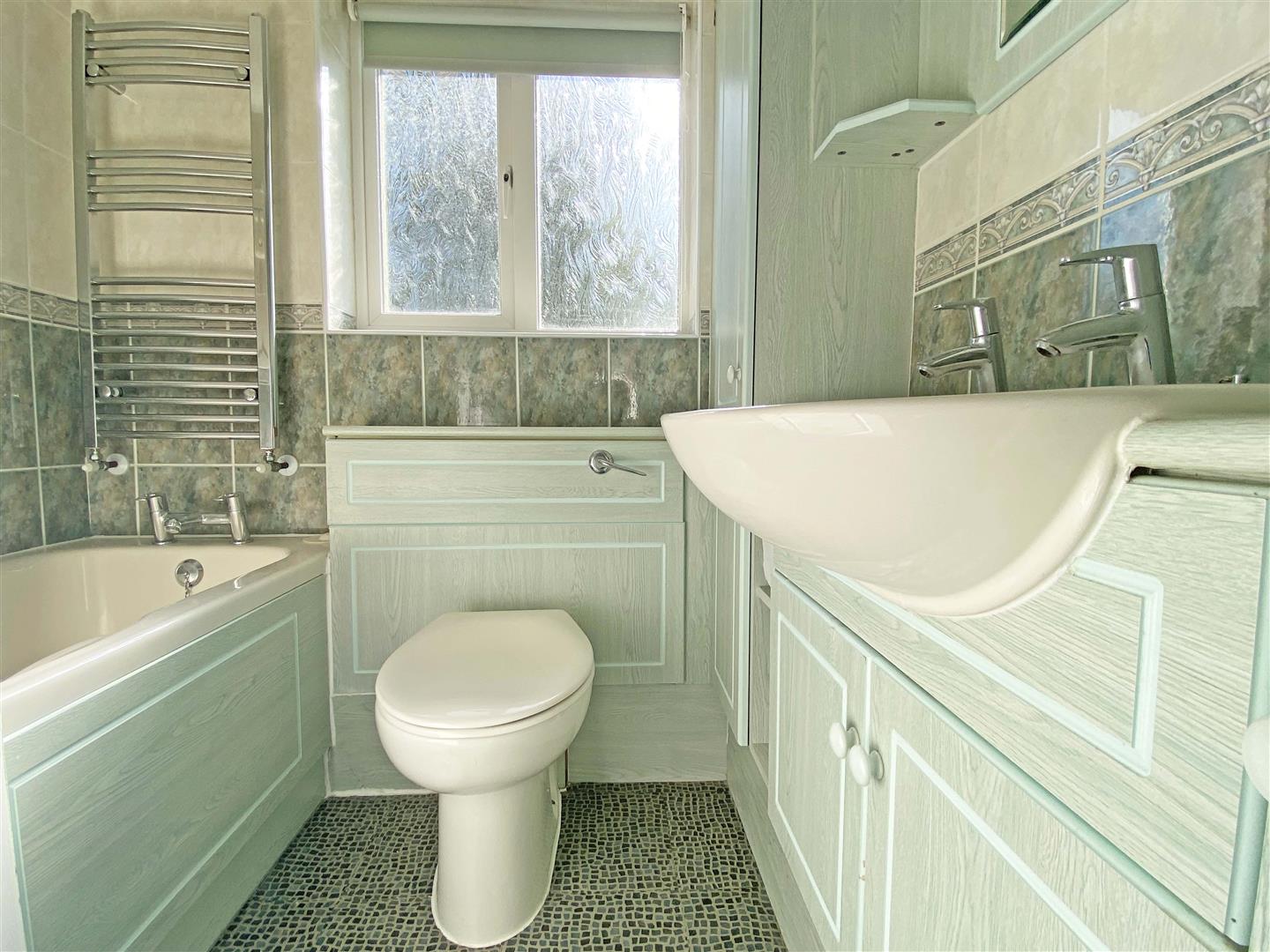 Obscure double glazed window to rear, panel bath with shower over, vanity hand wash basin, low level W/C, tiled walls, tiled flooring.