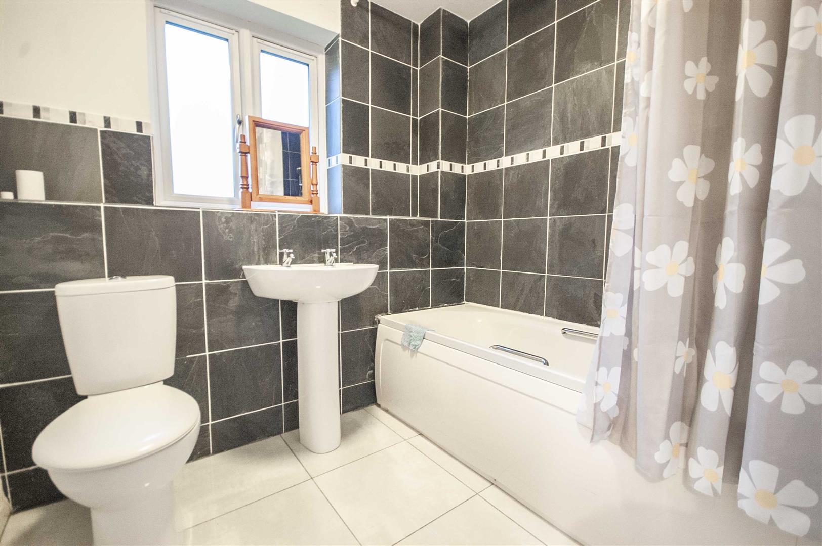 Bathroom: - 2.13m x 1.98m (7' x 6'6") - Obscure double glazed window to rear, panel bath with shower over, low level W/C, pedestal hand wash basin, chrome towel radiator, part tiled walls, tiled flooring.