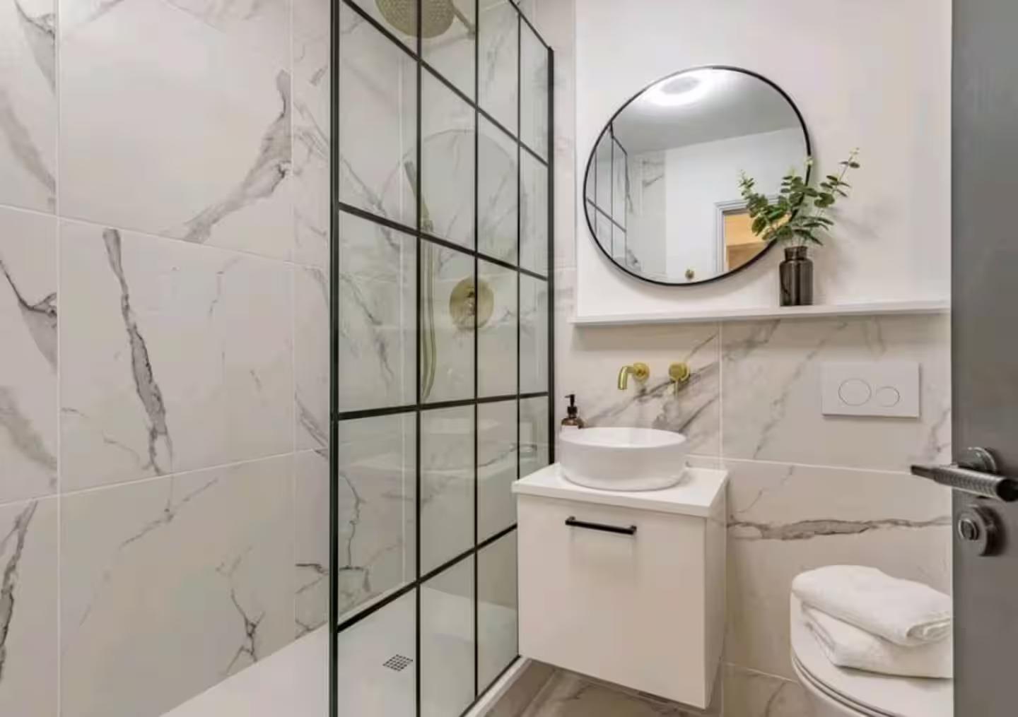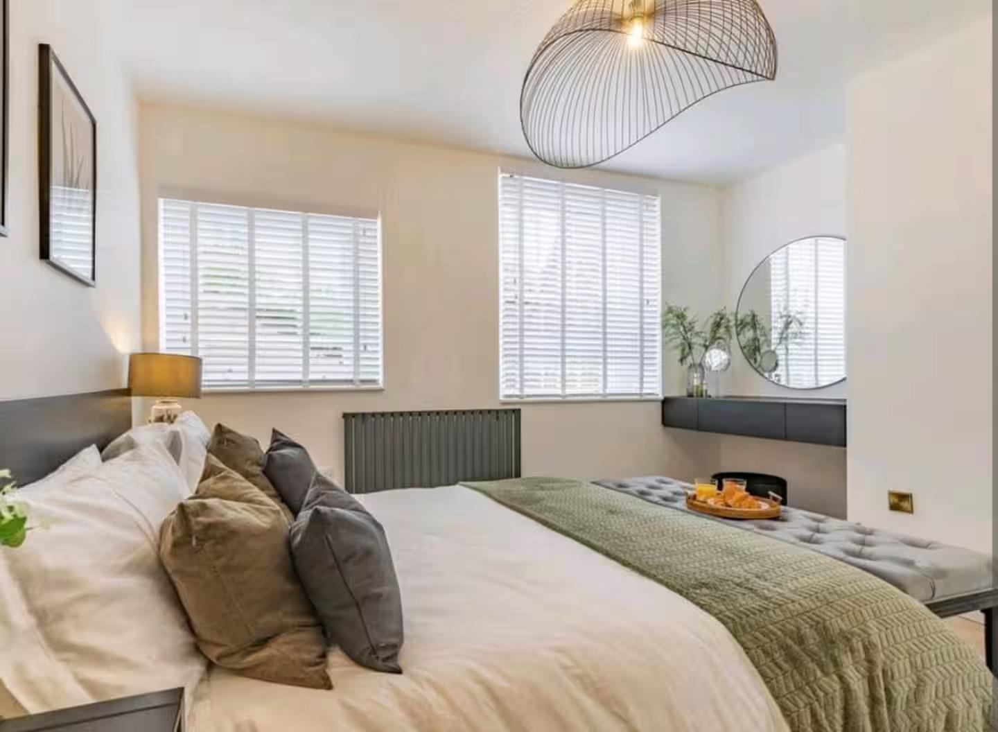 The double bedroom is spacious and bright, with two large windows allowing plenty of natural light to fill the space. Built-in wardrobe storage provides practical organisation. Completing the property is a marble shower room, finished to a high standard with modern fittings and clean, elegant design.
