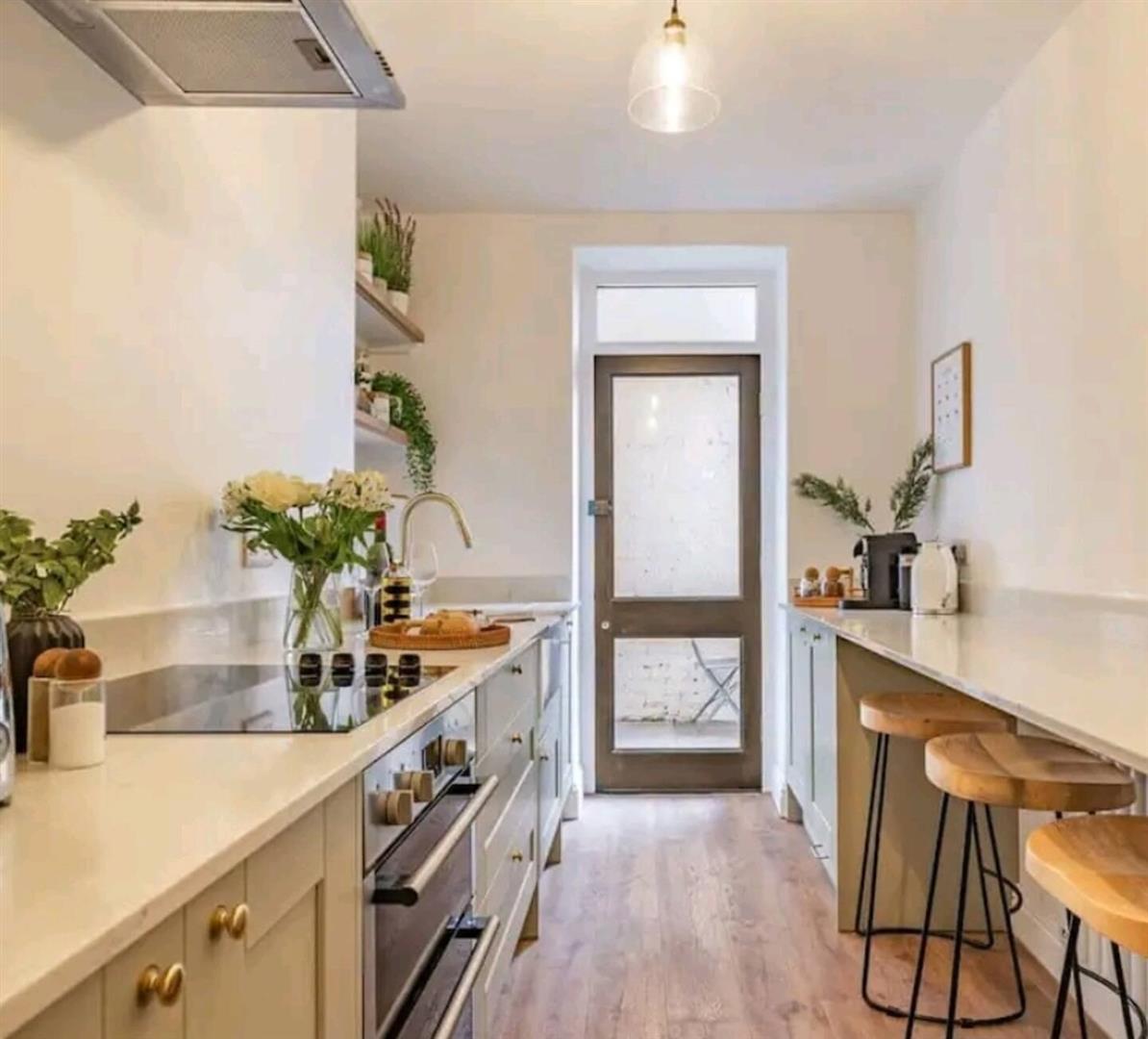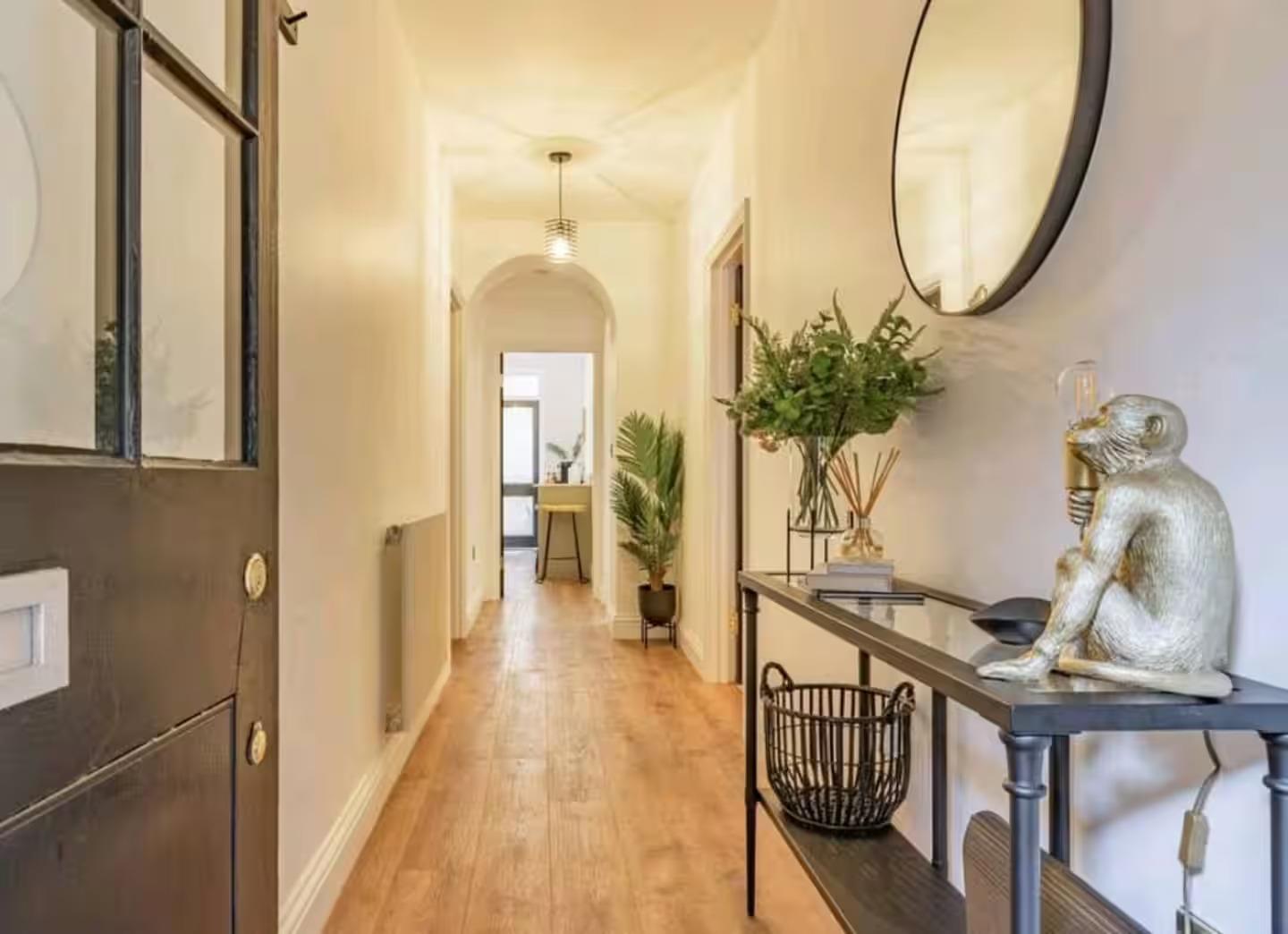 Upon entering the property, you are welcomed by a bright and inviting hallway that sets the tone for the rest of the flat. At the end of the hallway, an attractive archway leads into the modern kitchen, which is fitted with contemporary appliances, generous storage, and a convenient breakfast-bar seating area, ideal for everyday dining or enjoying a quiet morning coffee. A back door from the kitchen opens onto a small outdoor patio.