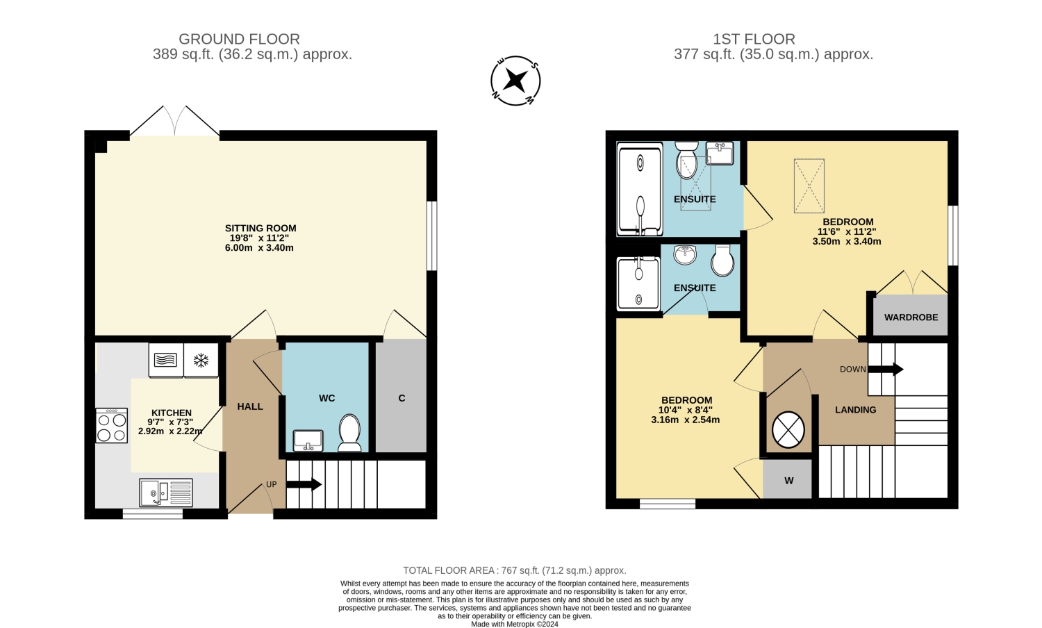 Upstairs boasts two double-sized bedrooms, each with en-suite shower rooms. Outside, the property features a courtyard garden and a single parking space, completing this charming residence.