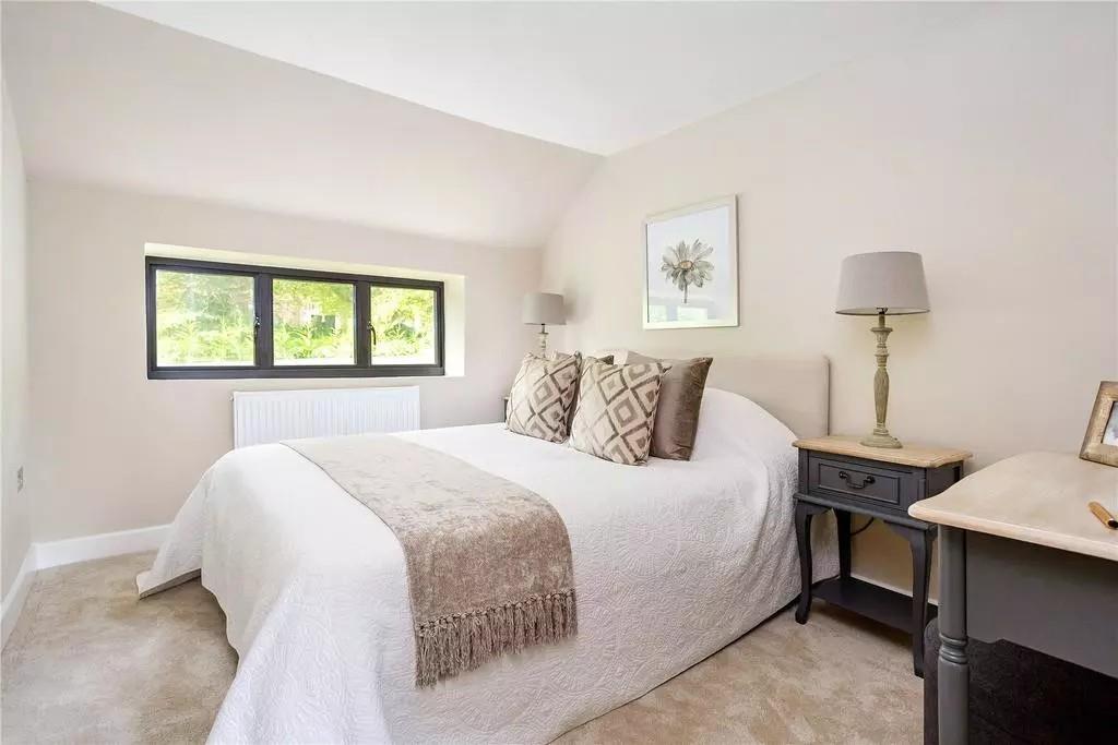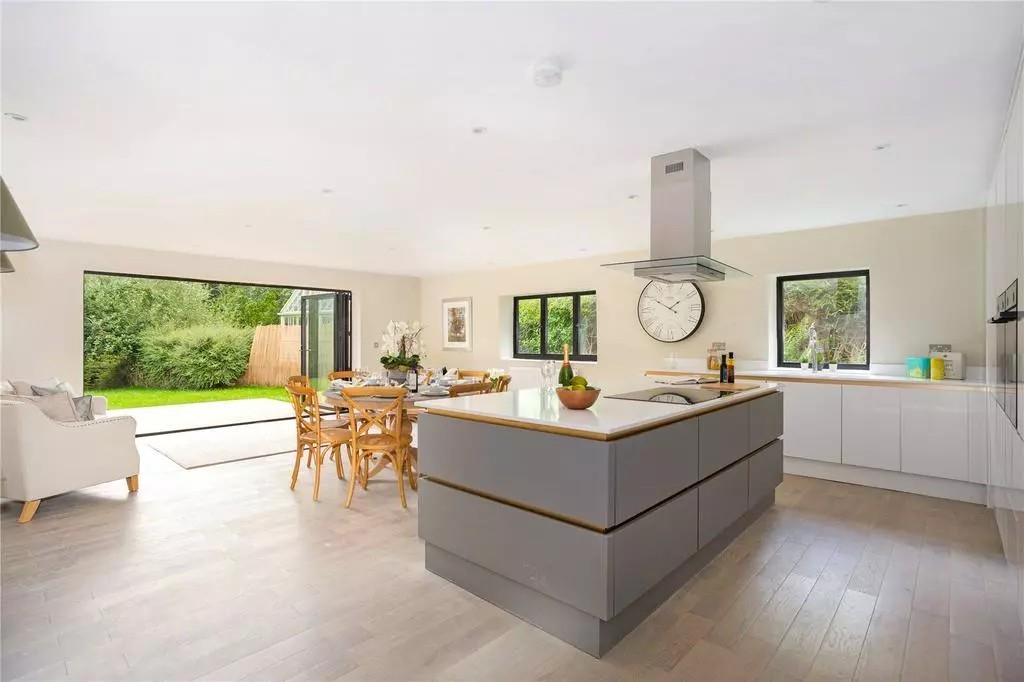 The cottage boasts a cosy dual-aspect sitting room with an open fireplace, ideal for relaxing evenings. An expansive open-plan kitchen/dining/family area features bi-fold doors that open to the garden, creating a harmonious indoor-outdoor living experience. The kitchen is equipped with an island, ample storage, and integrated appliances, making it a culinary enthusiast's dream.