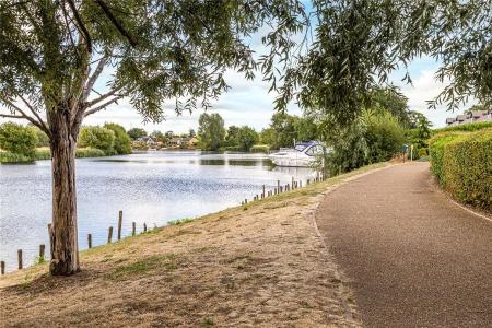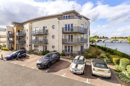 A modern one-bedroom, two-bathroom apartment in Chertsey, featuring a private balcony with stunning river views. This second-floor property offers a spacious lounge with a feature wall, a contemporary kitchen with integrated appliances, and a modern bathroom. The apartment also includes one allocated parking space.