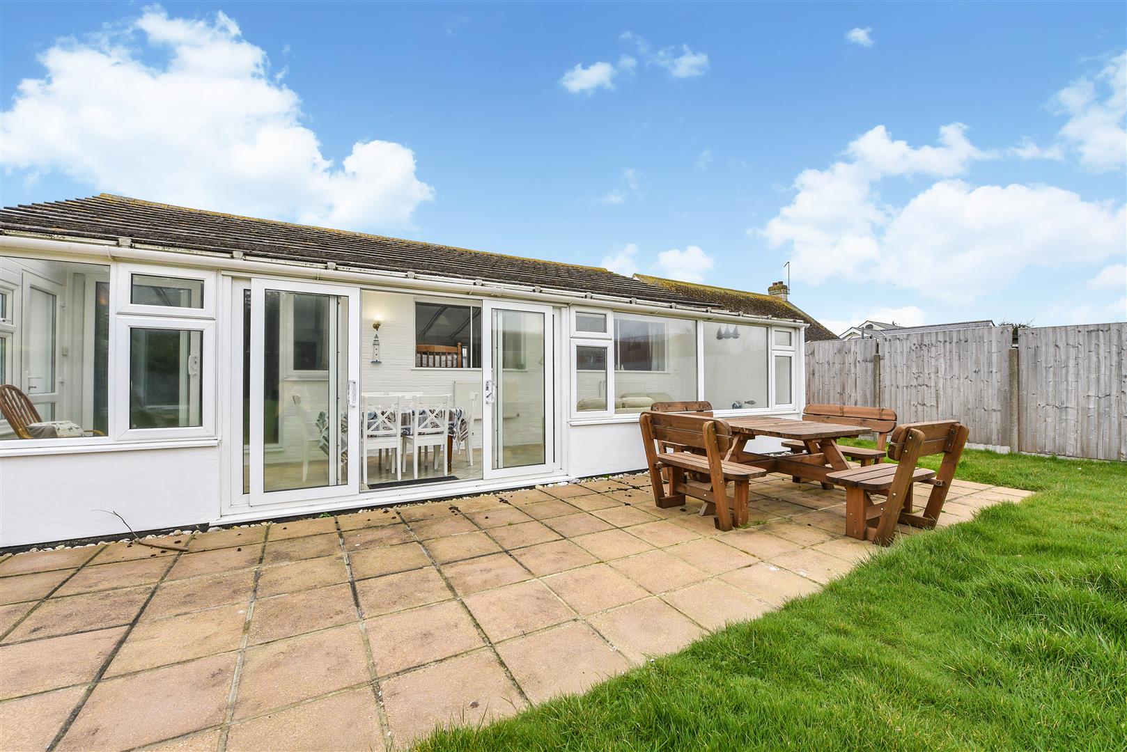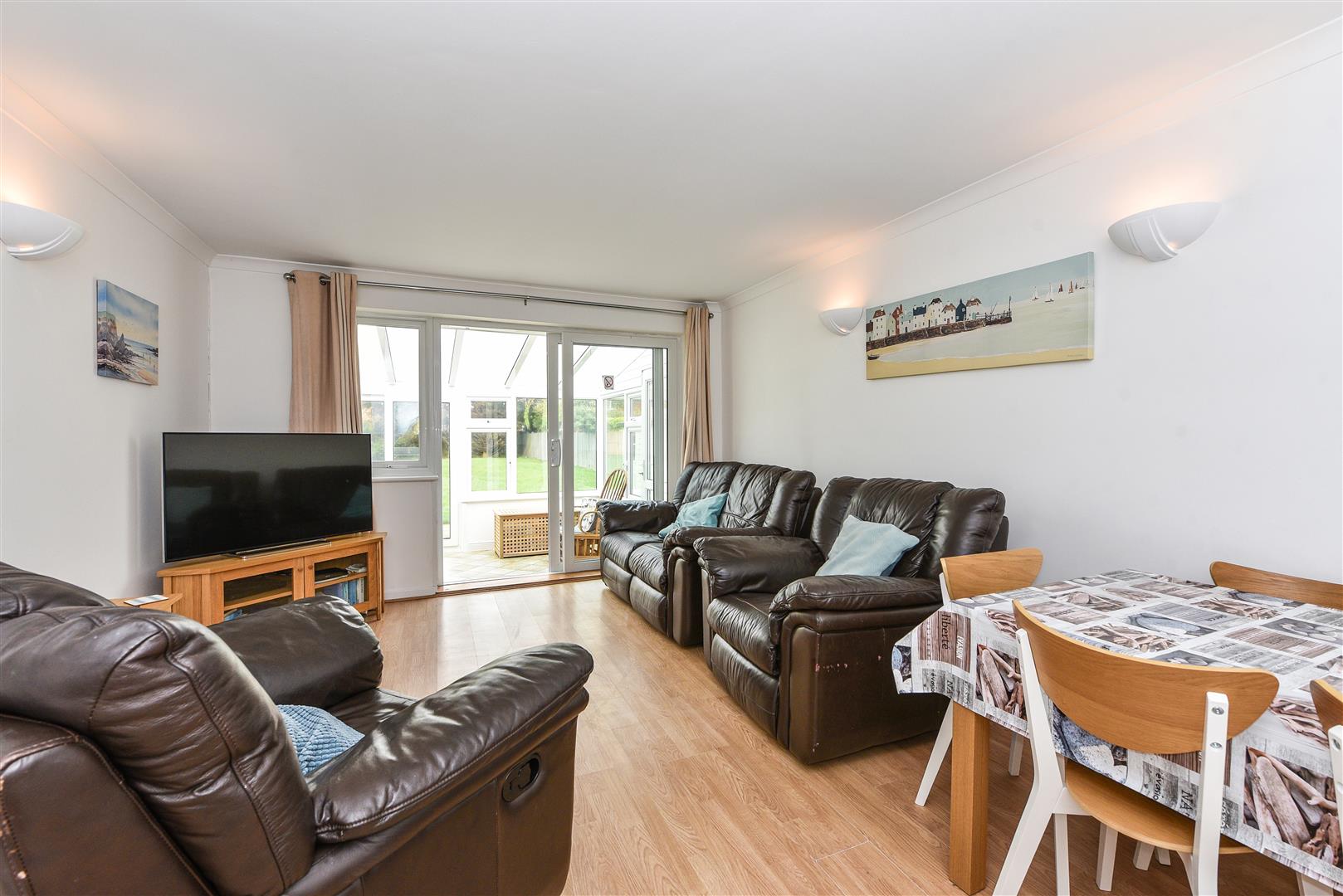 The property comprises living/dining room, sun room overlooking the spacious rear garden, kitchen with washing machine, dishwasher, microwave, fridge, freezer, gas hob and electric oven, bathroom with bath & separate shower cubicle, double bedroom with double bed, double bedroom with twin single beds and single bedroom with bunk beds.