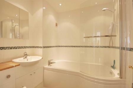 Bathroom - Modern suite with bath having electric shower over and glass screen. Semi recessed wash basin with cupbaord below and mirror fronted cupboard above. Recessed WC. Mini downlighters.