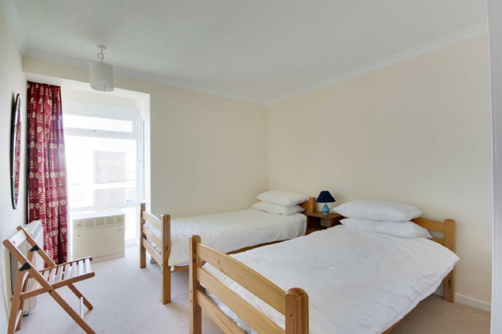 Bedroom Two - Sea view. Two 3' single beds with duvets and four polyester/cotton pillows..