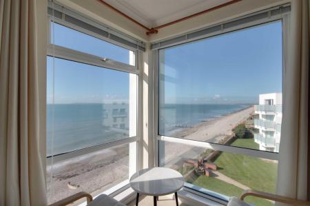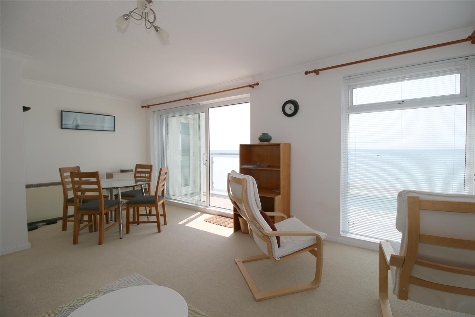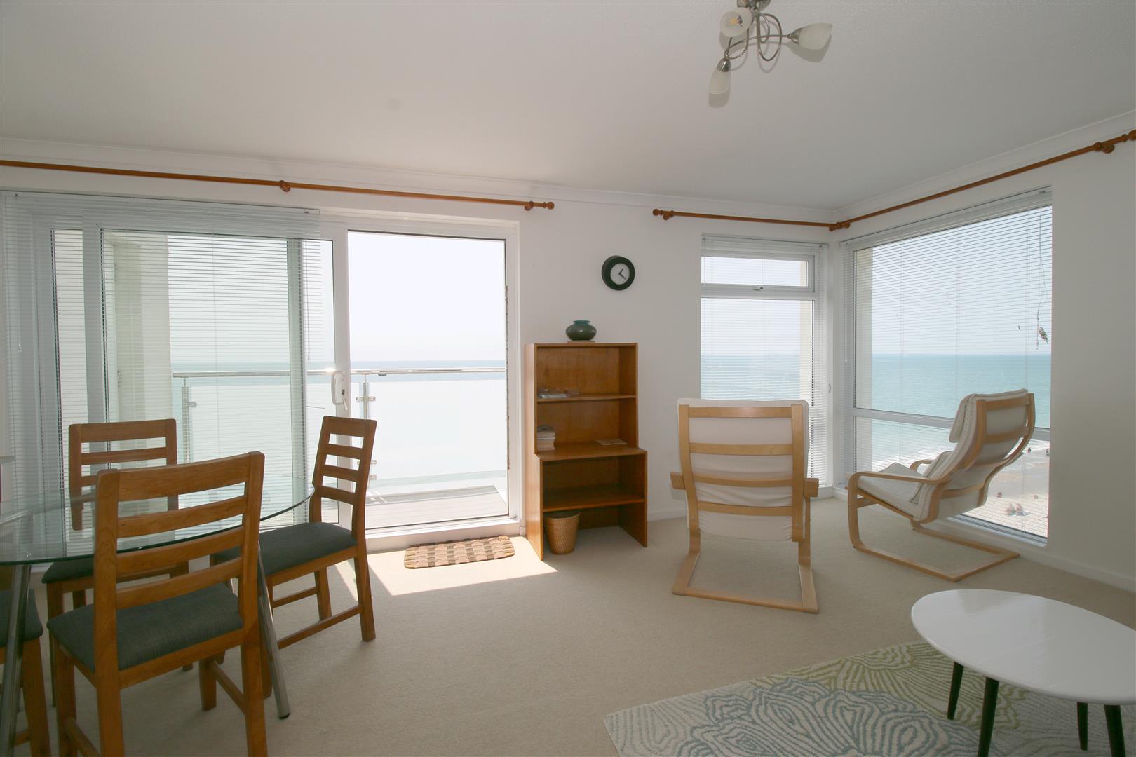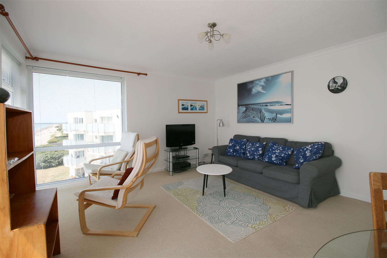 Living Room - Double aspect with views to the south and west along the coast and across The Solent. Access onto a South facing balcony. Large flat screen TV with 'Freeview', DVD player and Video. L shaped sofa arrangement with two additional chairs. Circular glass topped dining table with four dining chairs