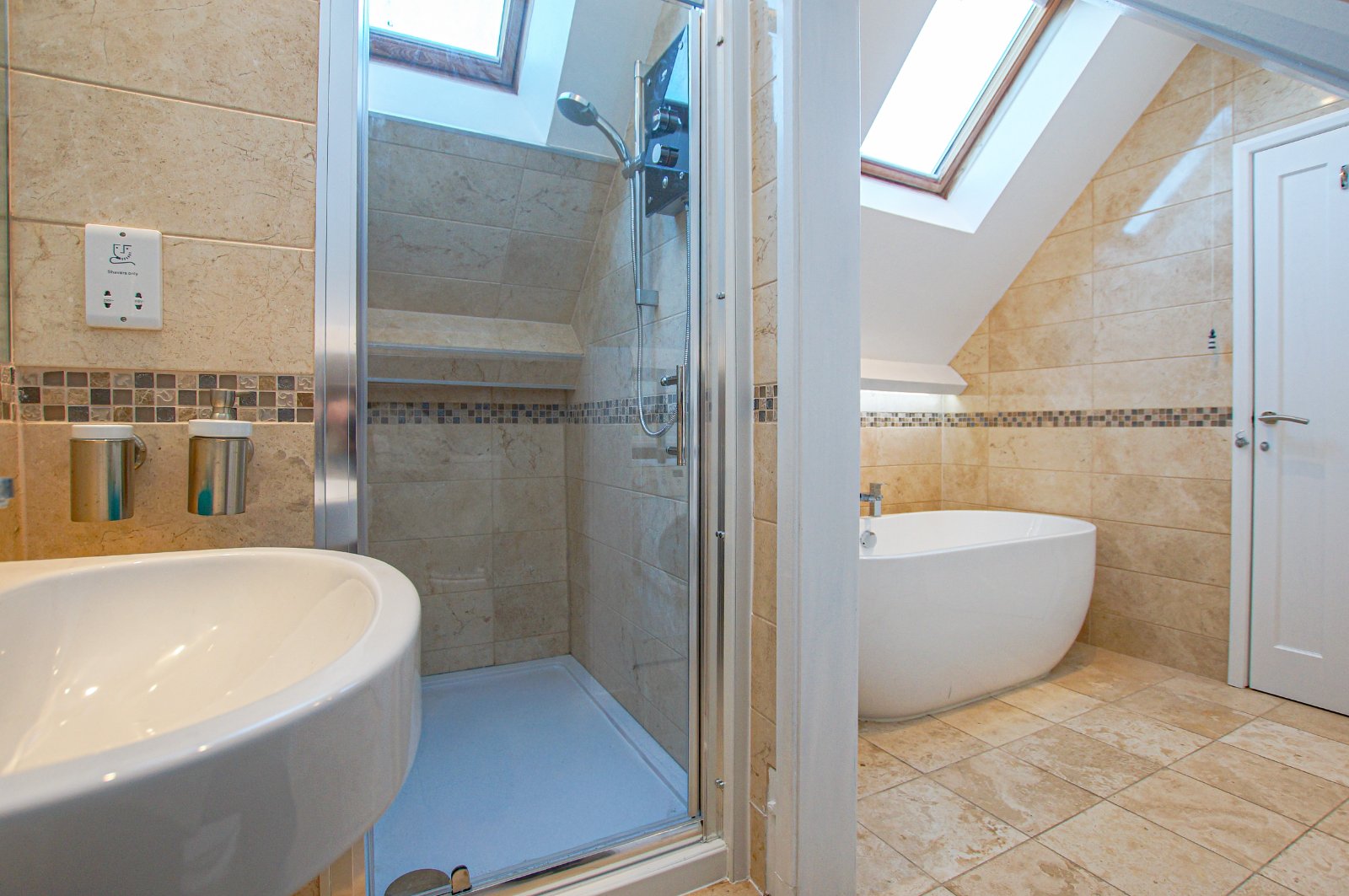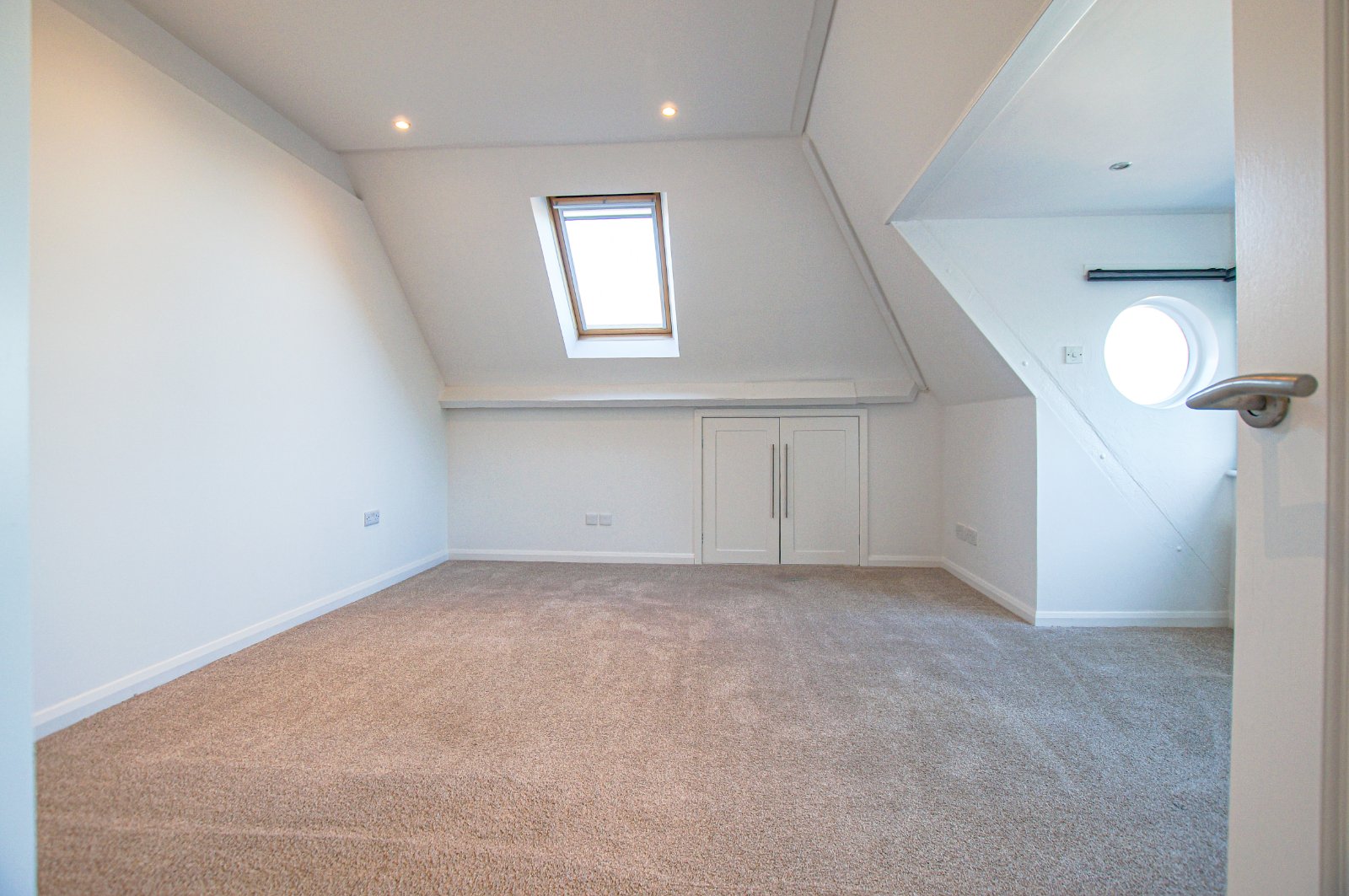 Beyond the living areas lie two well-proportioned double bedrooms. The principal bedroom enjoys captivating views across the harbour, a constant reminder of the property’s exceptional location.