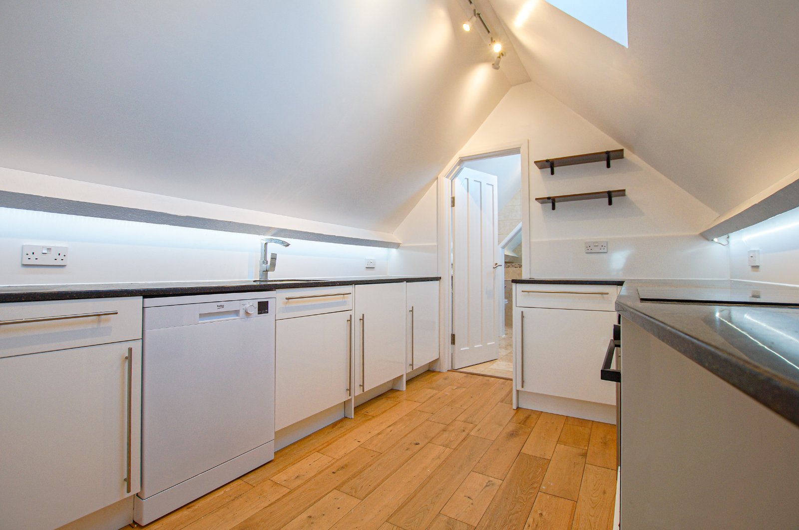 The modern, thoughtfully designed kitchen is both stylish and practical, featuring a quality cooker, integrated dishwasher, and dedicated space for an under-counter fridge-freezer. From here, a discreet corridor flows towards a beautifully appointed bathroom, which includes a bath with overhead shower, WC, wash basin, and a cleverly integrated laundry zone with both a washing machine and tumble dryer.