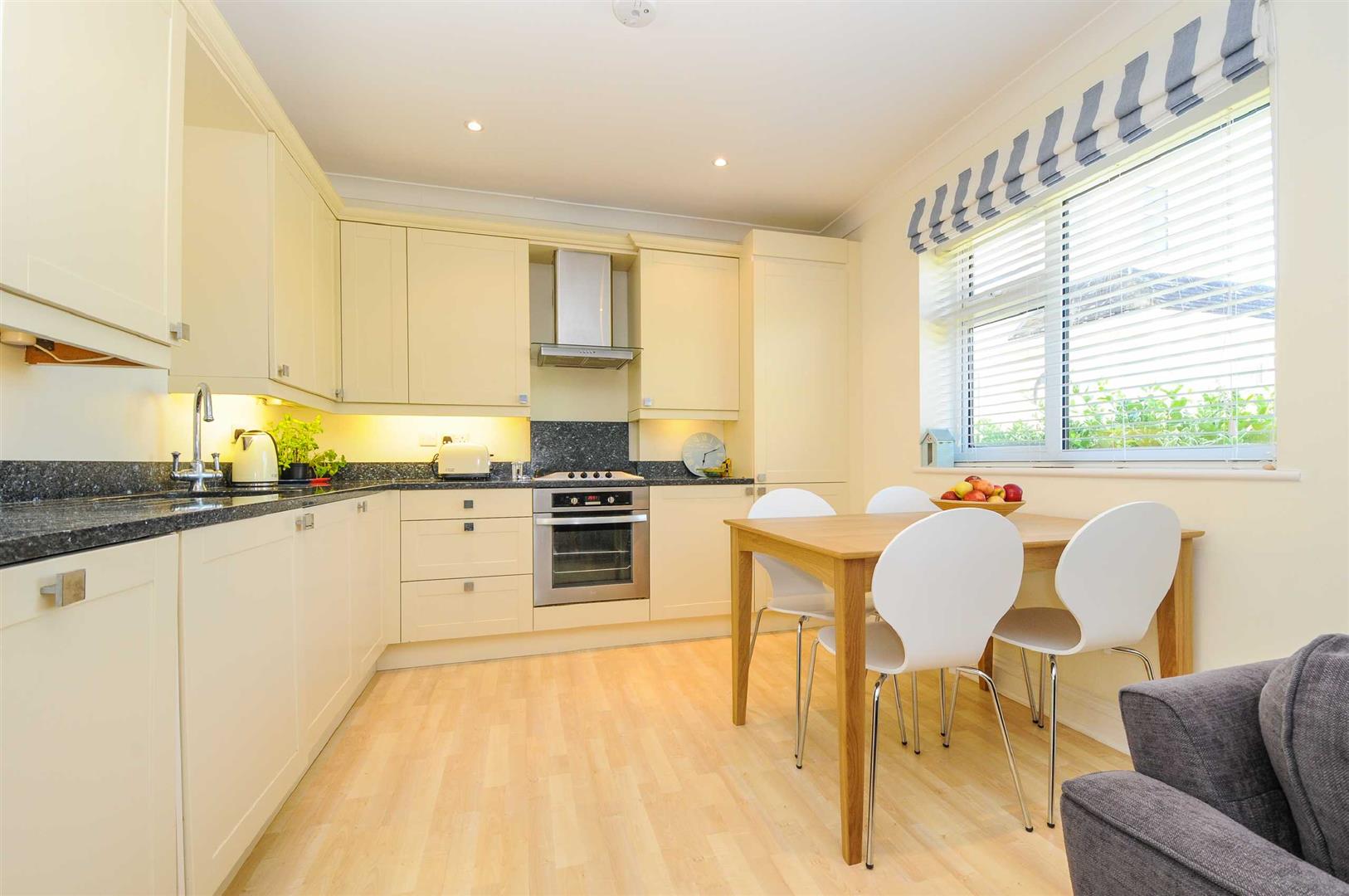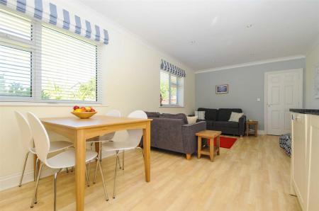 Lounge/Dining Room/Kitchen - 22'3" x 10'3" - Beech laminate flooring, with cream coloured cupboard units with granite work surfaces with inset sink. Built-in electric oven with ceramic hob and cooker hood over. Integrated fridge/freezer, automatic washing machine and dishwasher. Wall mounted 'Worcester' gas fired central heating boiler, radiator.