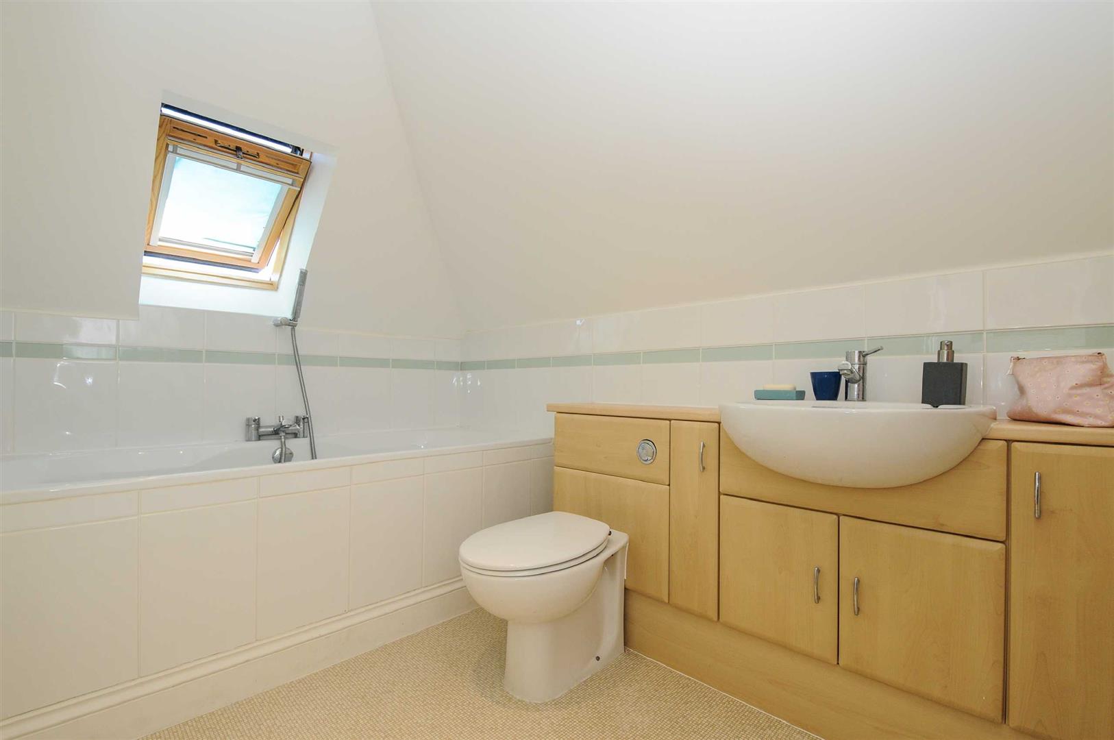 Bathroom - Part tiled, panelled bath with centre positioned mixer taps with shower attachment, semi-recessed hand basin with cupboard under, low level WC, chrome towel rail/radiator.