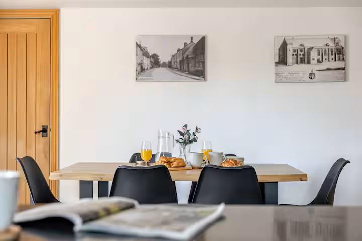 The ground floor is centred around an impressive family/sitting room, featuring herringbone oak flooring and a log burner set on a flagstone hearth, creating a warm and inviting focal point. This room flows into a dual-aspect dining area, with a subtle split-level transition leading to a study space, formerly the village post office and ideal for home working or quiet reading.