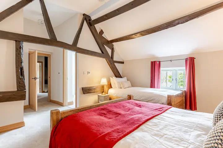 On the first floor, the accommodation is arranged around a generous landing with vaulted ceilings and exposed beams. The principal bedroom enjoys a rear aspect and is served by a modern en-suite shower room. Bedroom two is a comfortable guest bedroom with its own en-suite, while bedrooms three, four, and five are all well-proportioned and served by a stylish family bathroom.