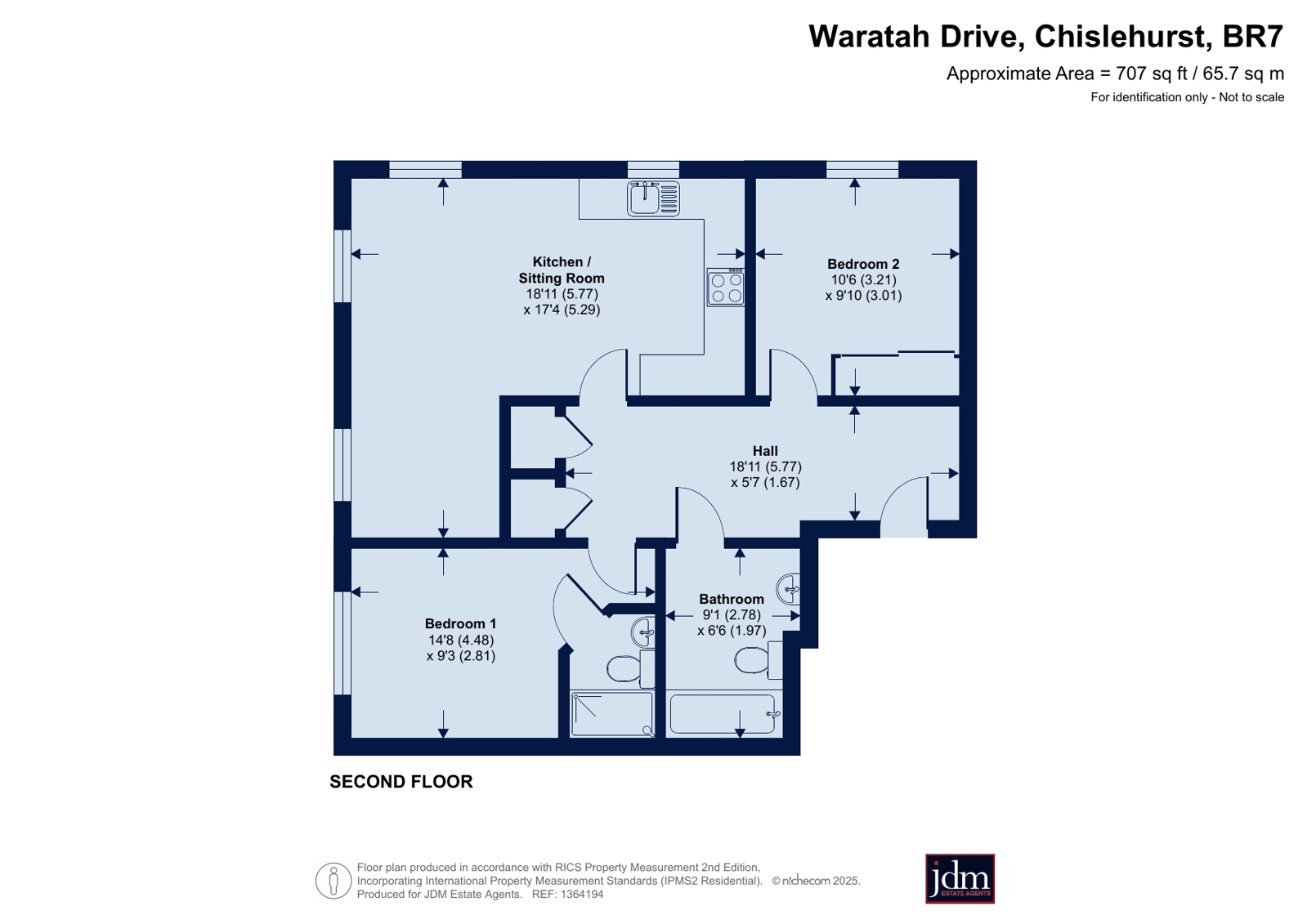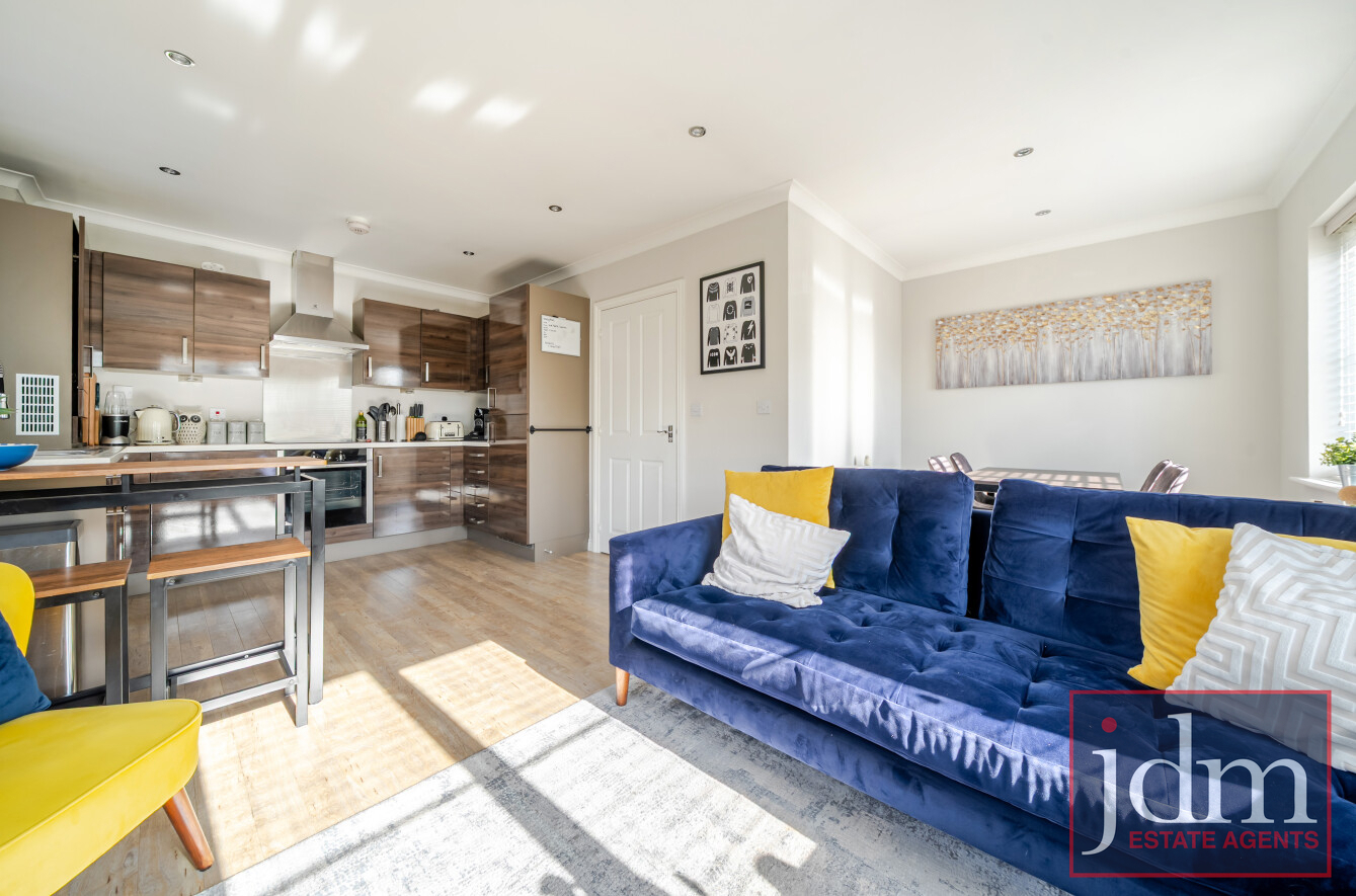 The property features two generous double bedrooms, two bathrooms (including an en suite), and a large open-plan living area with a fully fitted kitchen complete with integrated appliances. Allocated parking.